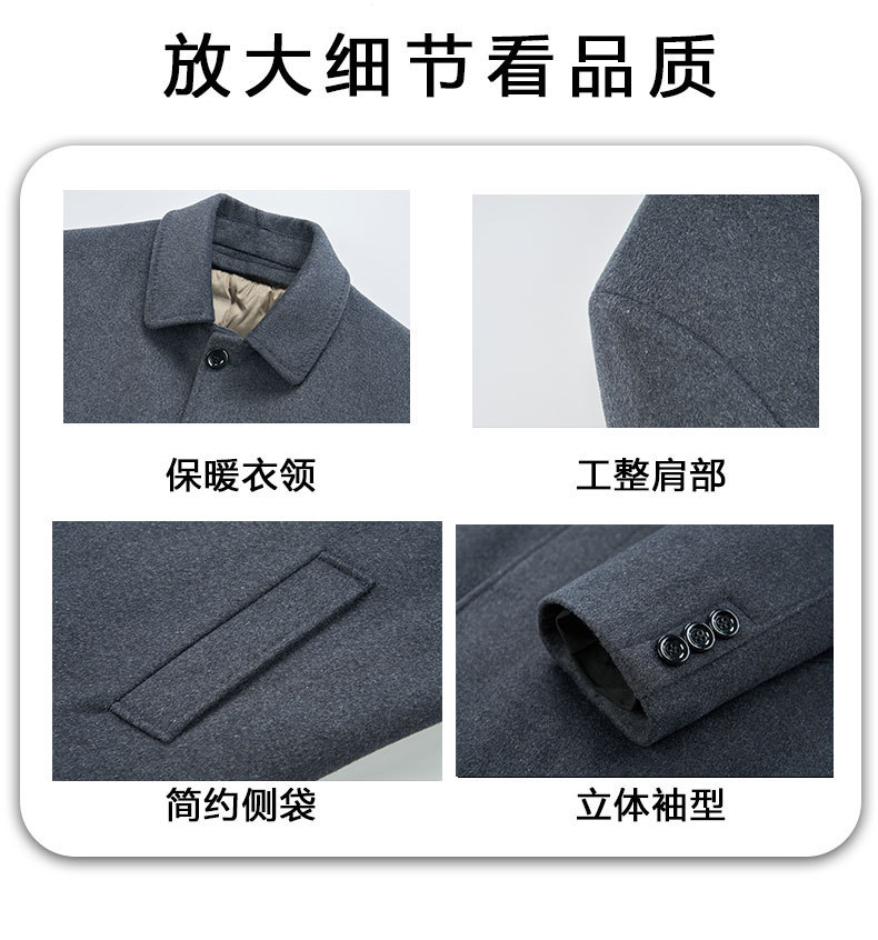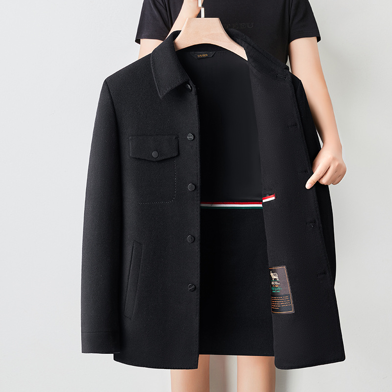 秋冬のショートタイプの男性のカシミヤのコートの中年の襟のウールのジャケットは両面のラシャのジャケットを厚くします。