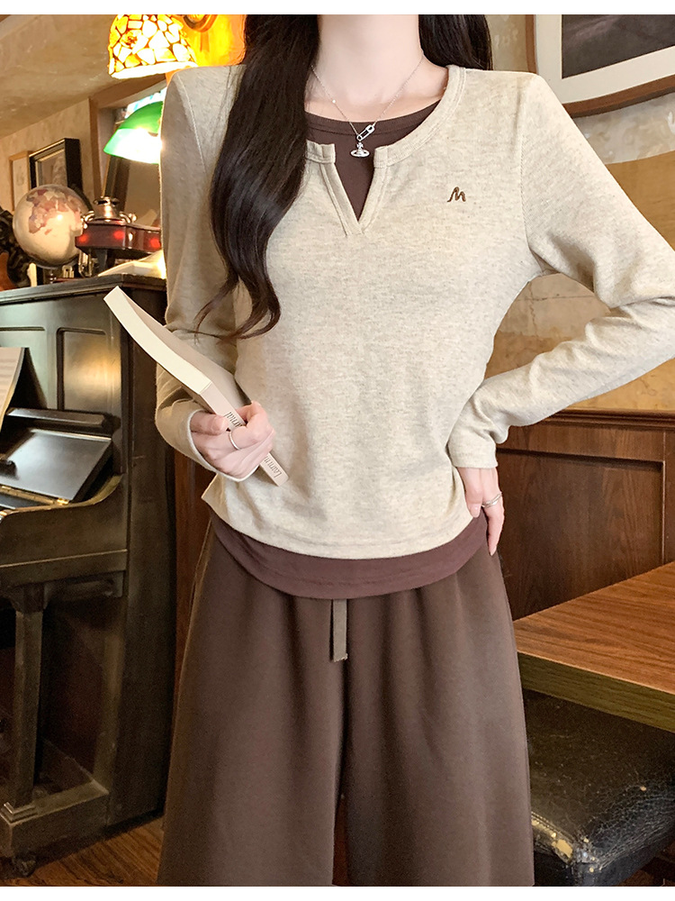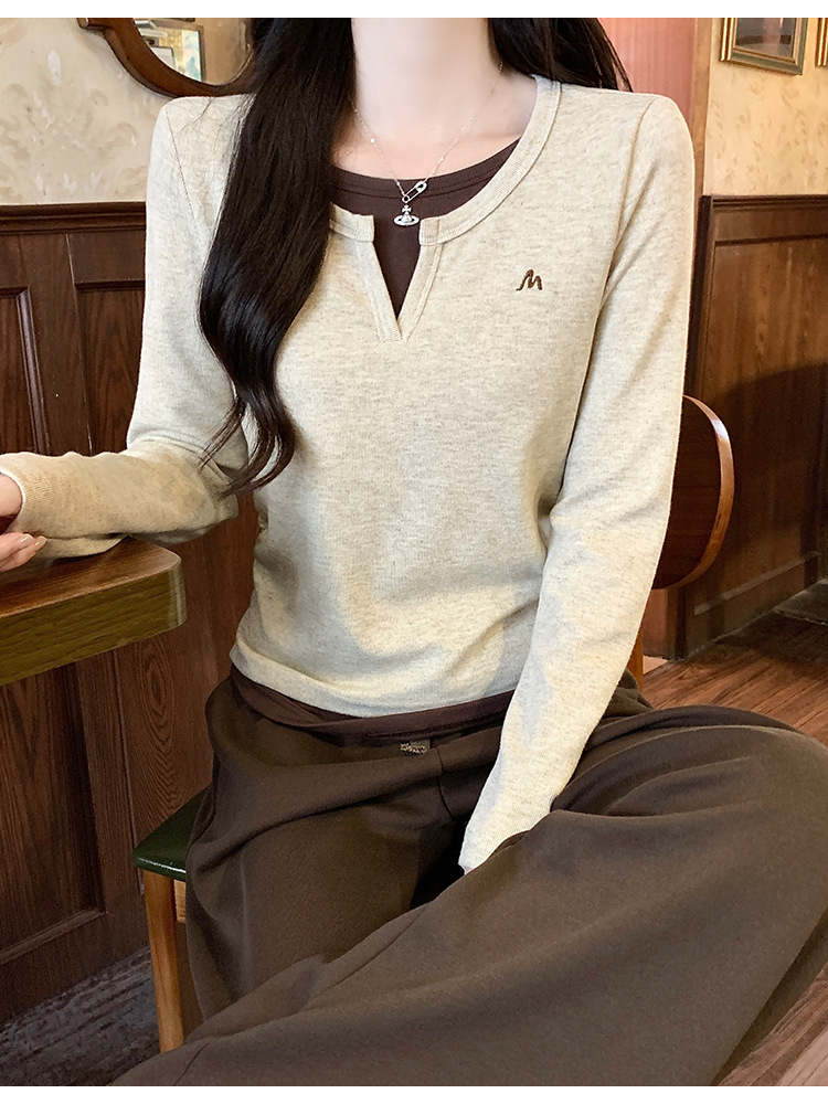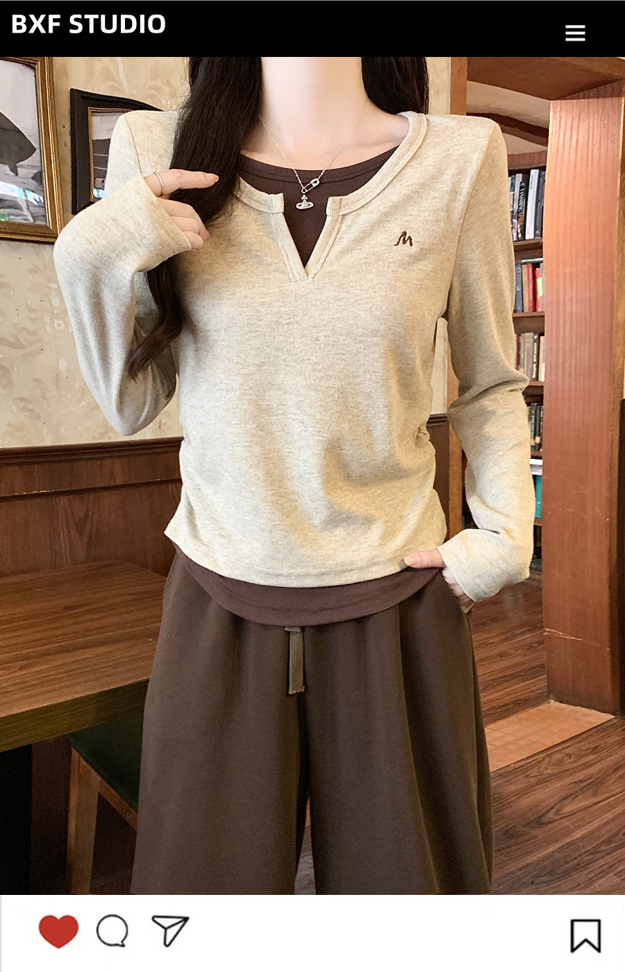 Vネック長袖フェイクツーピースデザインレディーストップス2025秋新作スリムフィット痩身Tシャツショート丈インナーレイヤードシャツ
