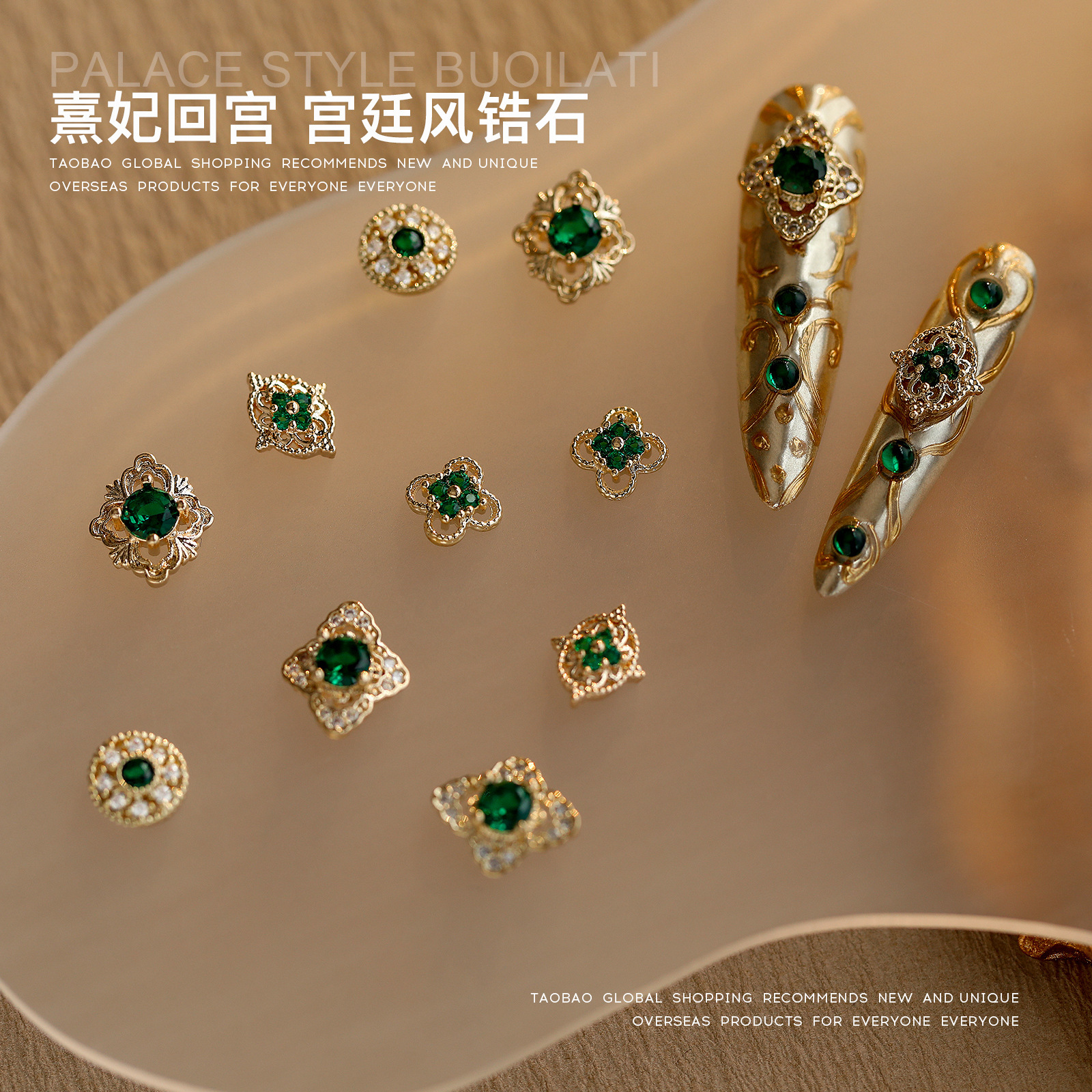 中国式宮廷復古風ジルコンネイルアクセサリー翡翠緑合金にドリルを入れて洗練された甲装飾品卸売りをしている
