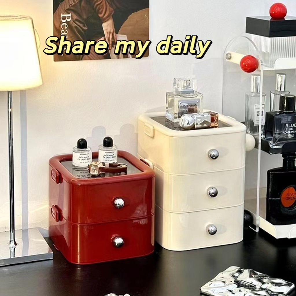 多功能收纳盒轻奢中古风防尘家用桌面收纳柜简约复古化妆品置物架