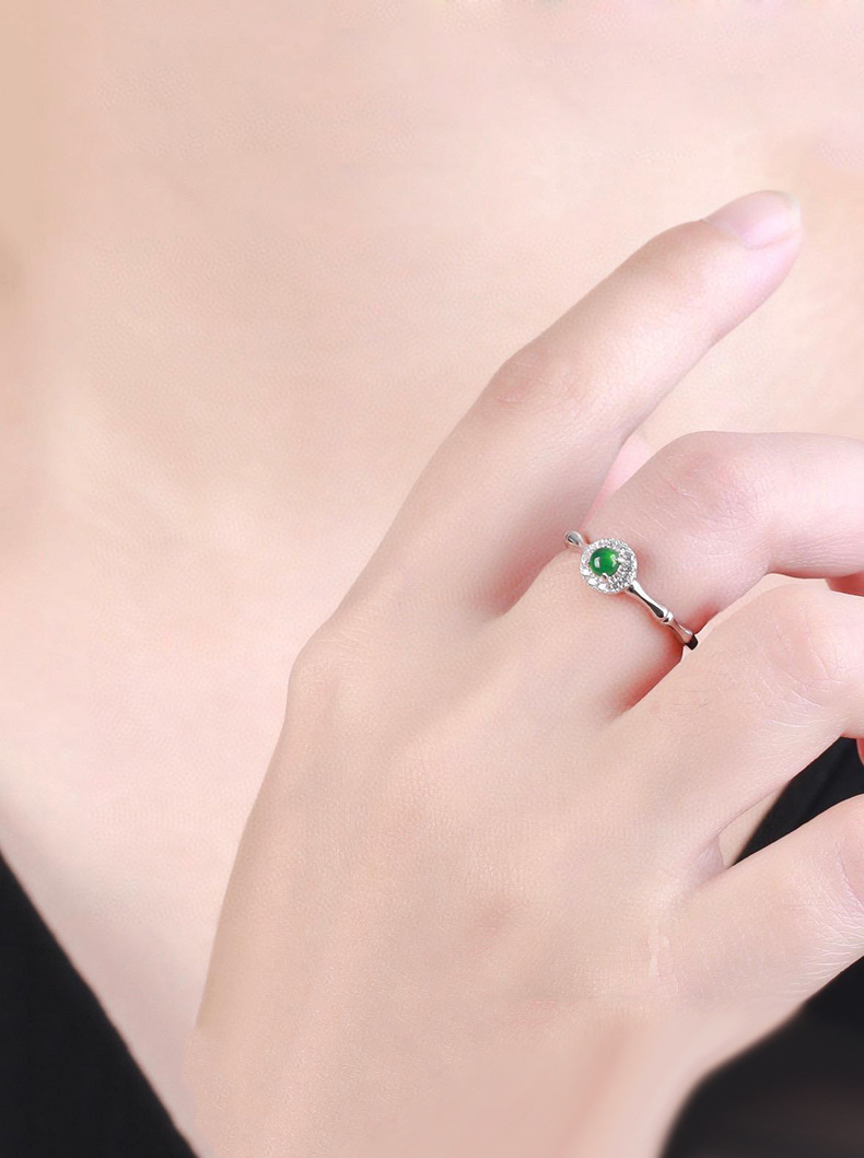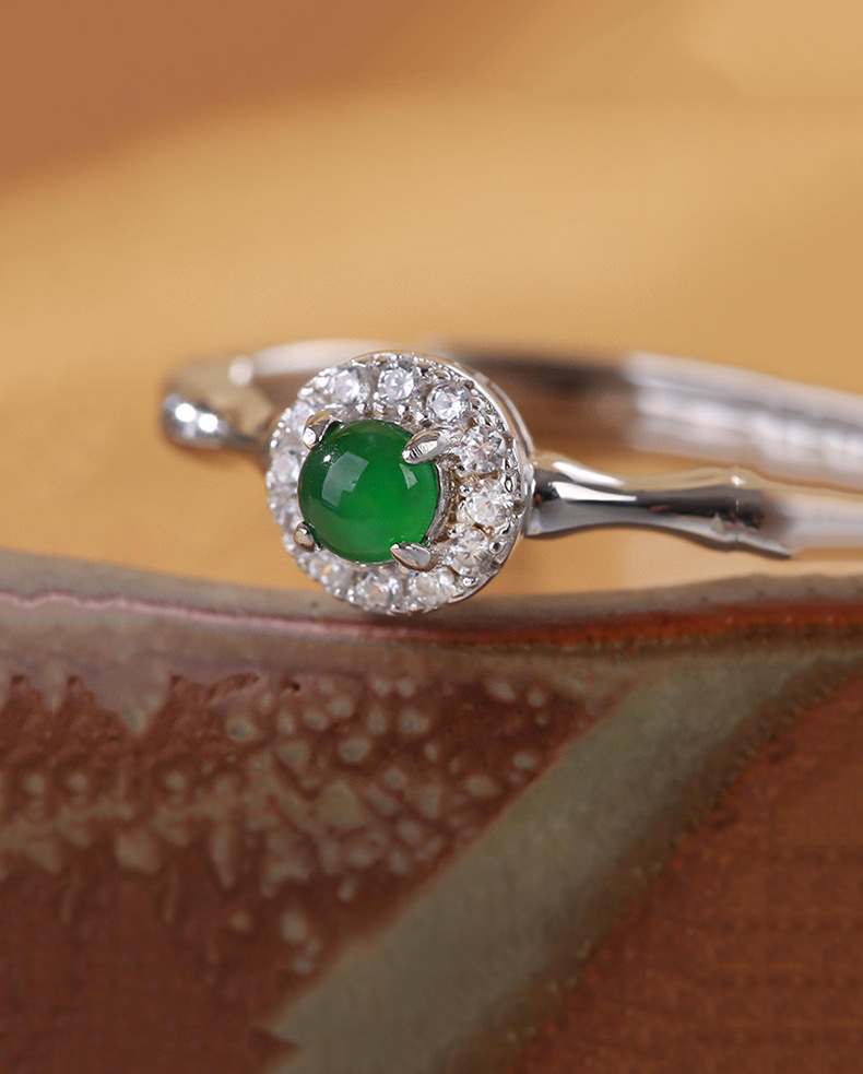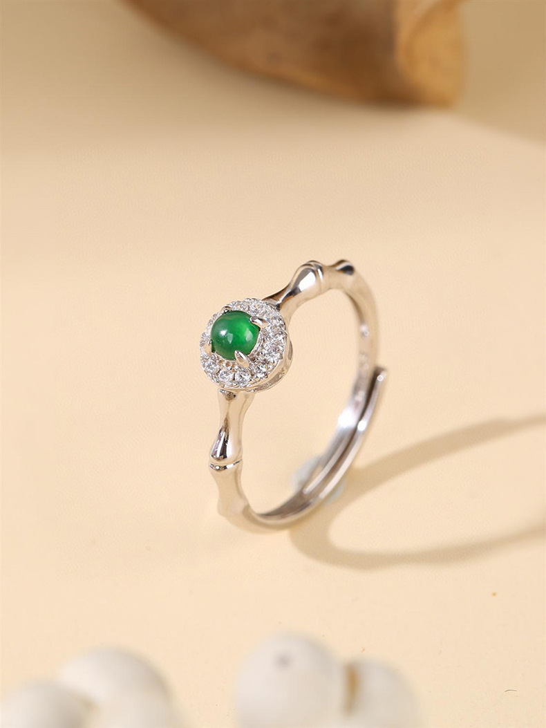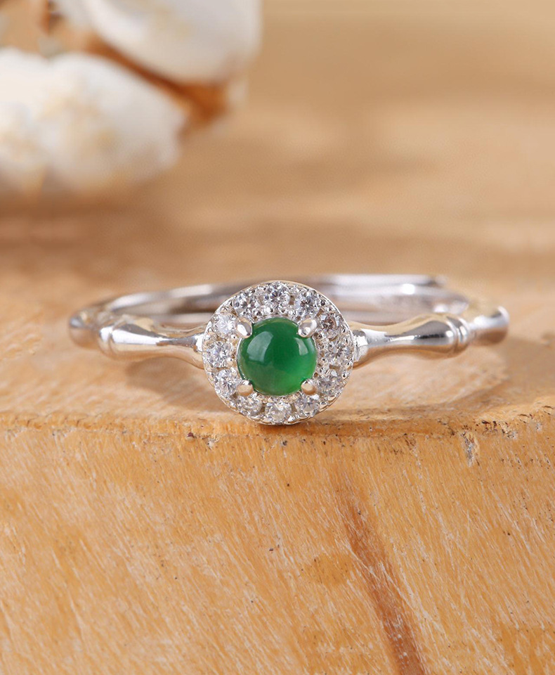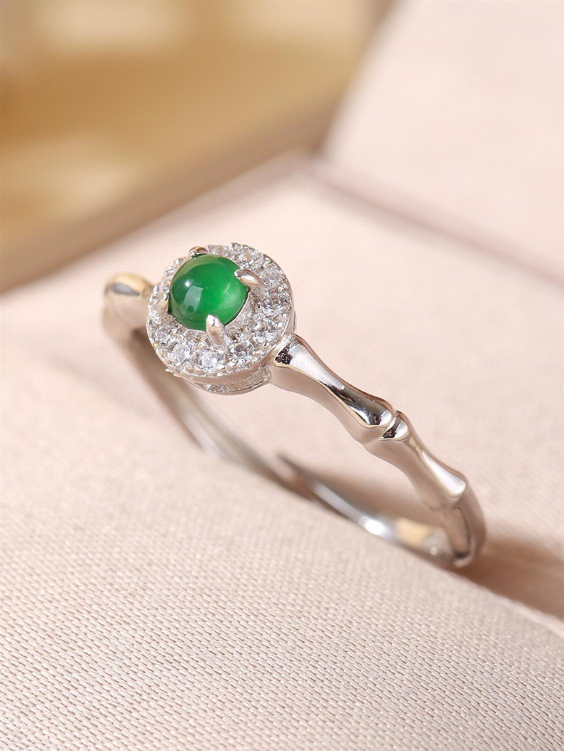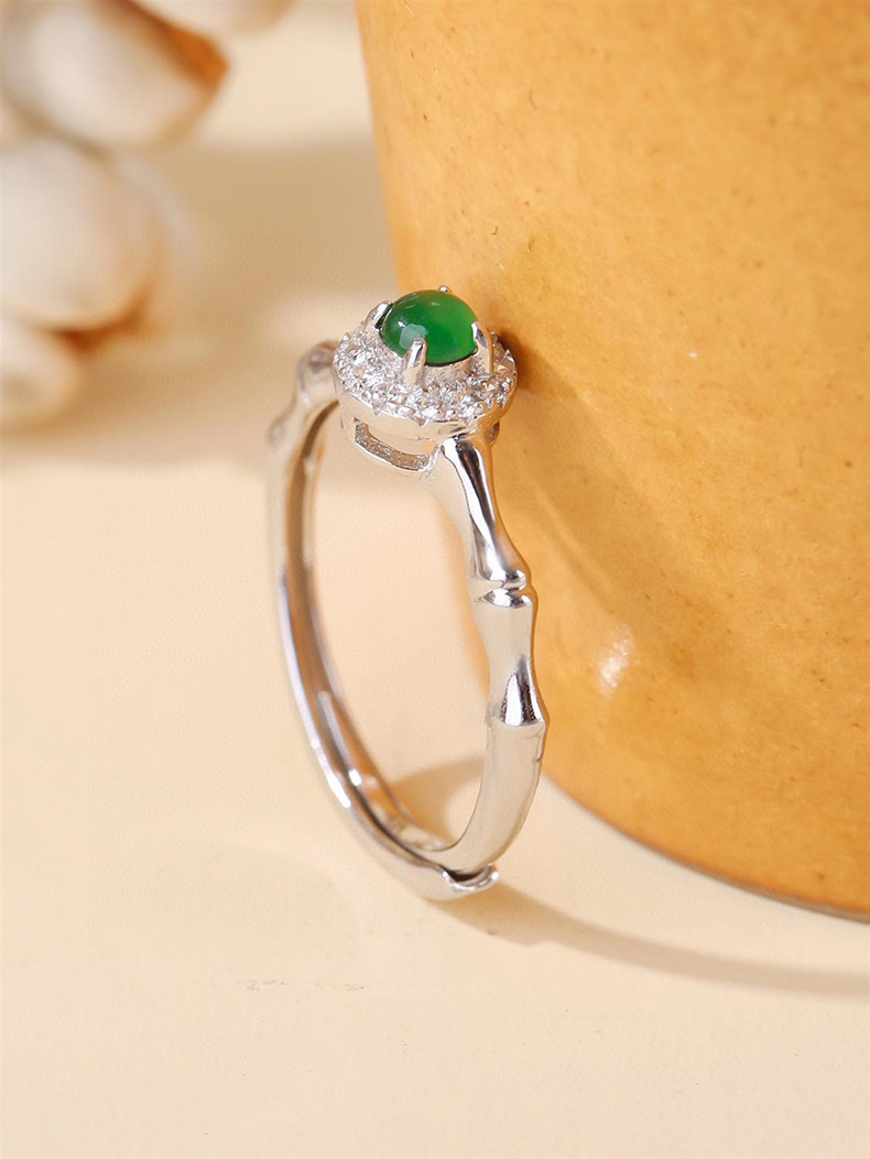 天然模造和田玉卵面グリーンジルコン指輪レトロファッション飾り陽緑竹節指輪ジュエリーアクセサリー女