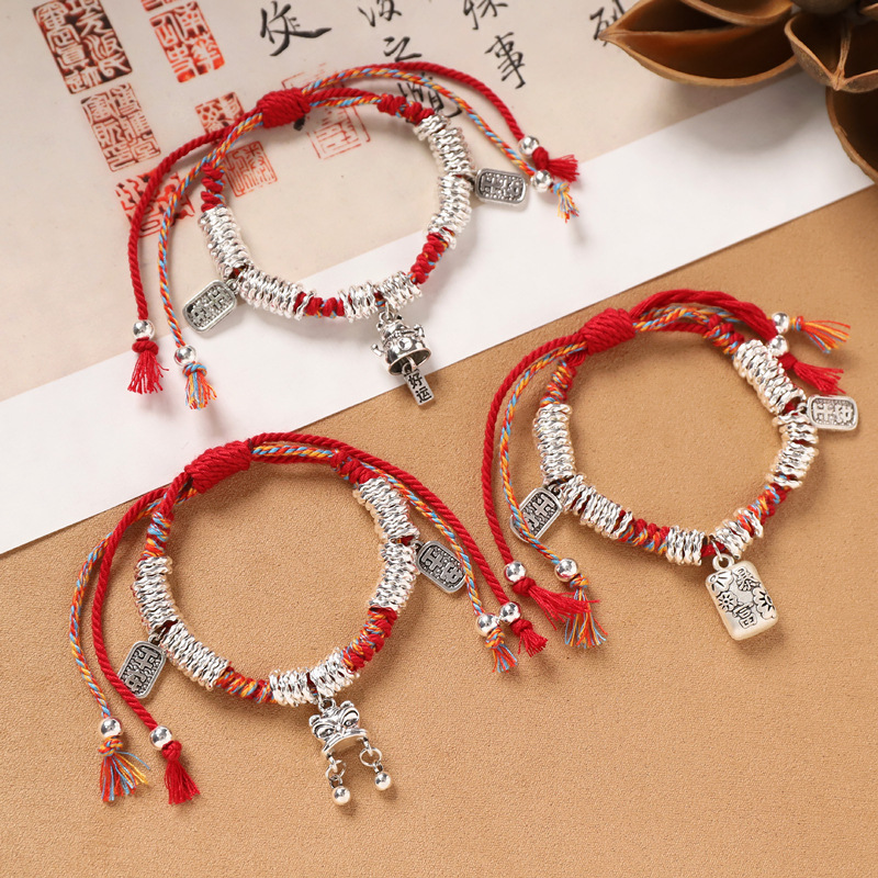 チベット式の手作りの銀はブレスレットの本命の年を巻いて赤い色の縄を編みます。