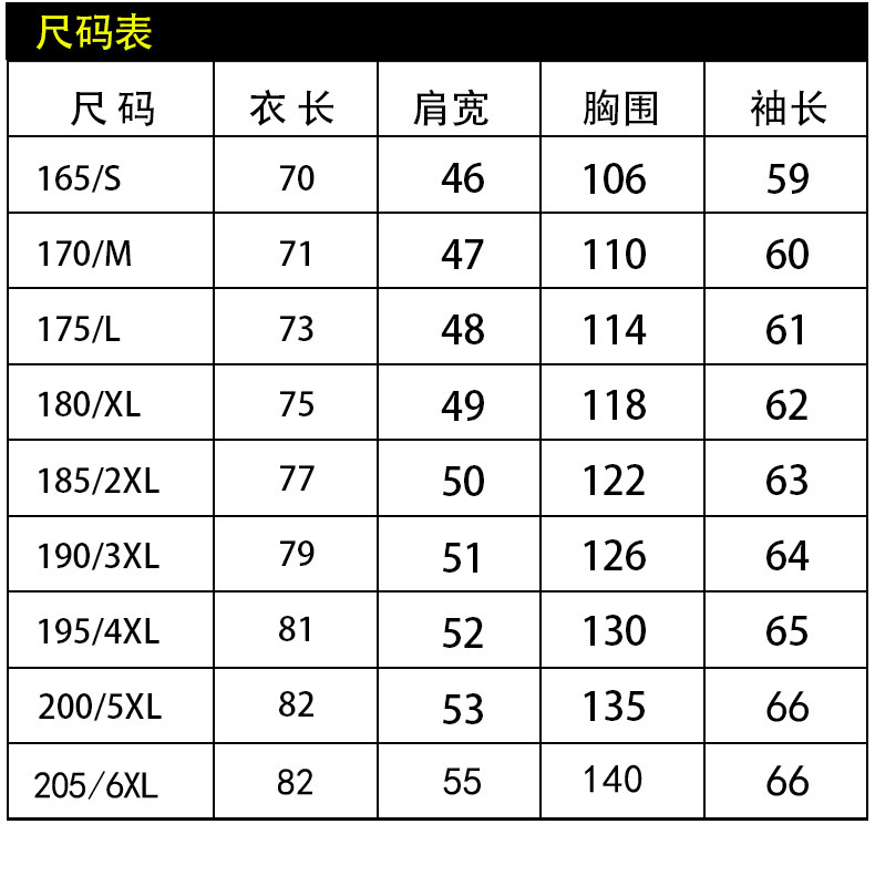 170/M,175/L,180/XL,185/2XL,190/3XL,195/4XL,200/5XL,205/6XL
