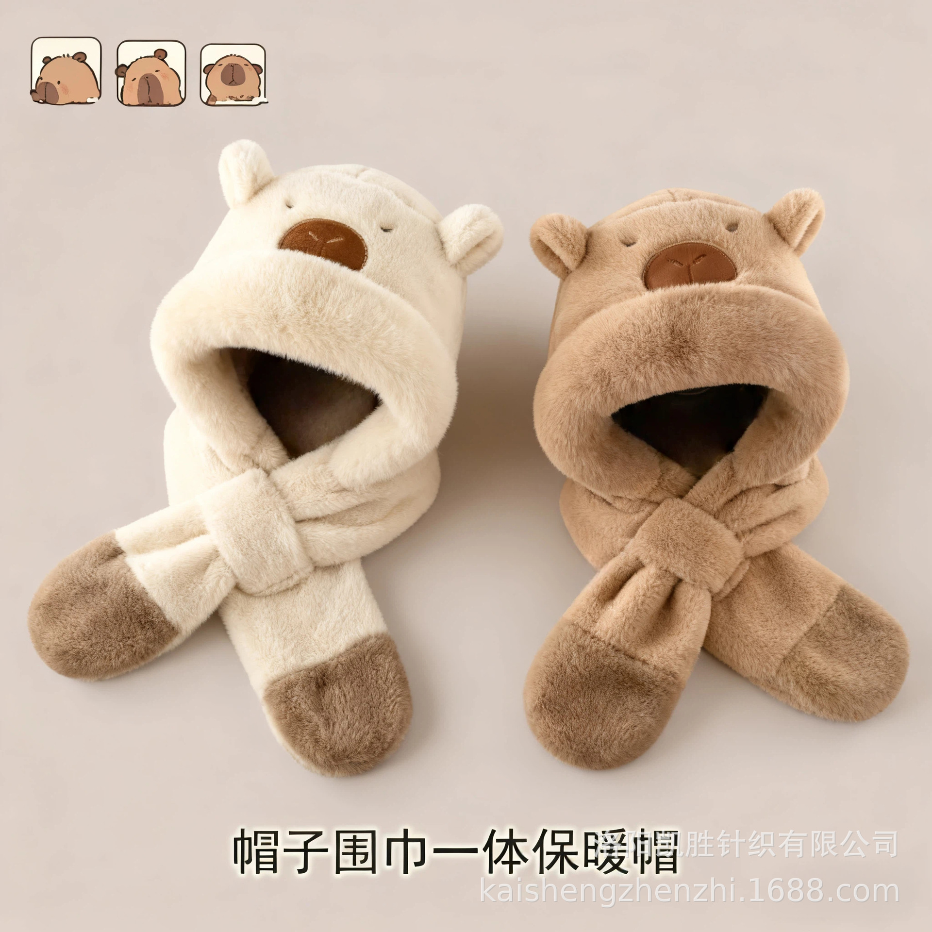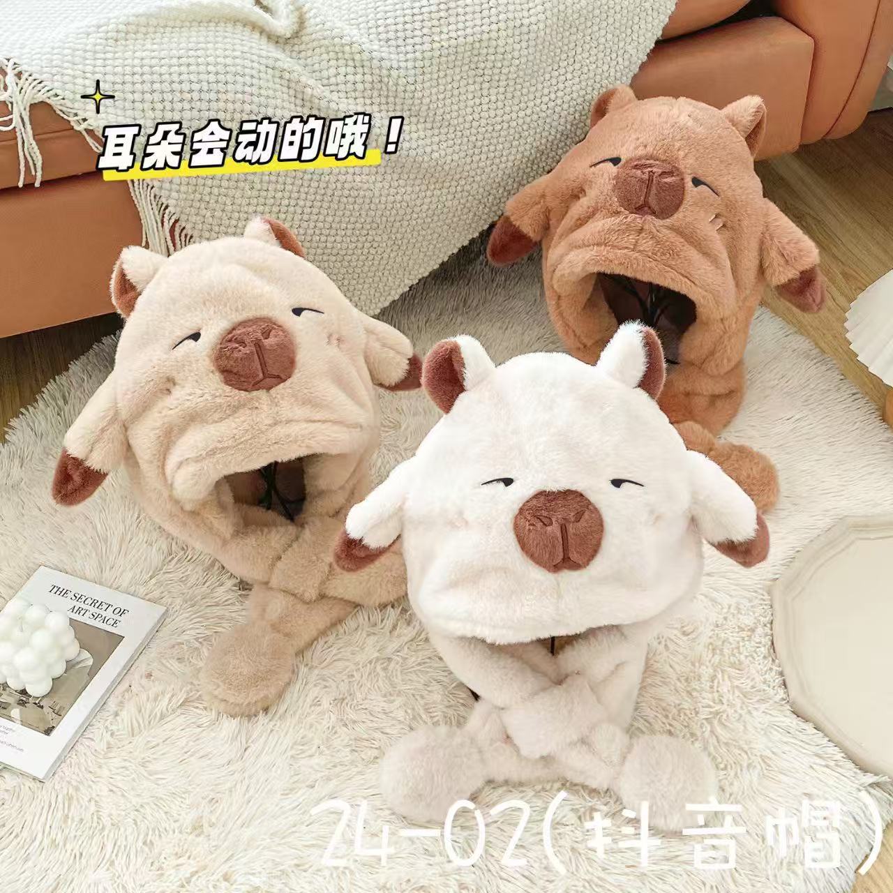 秋冬新款儿童帽子卡皮巴拉可爱毛绒围巾一体二件套保暖护耳帽批发