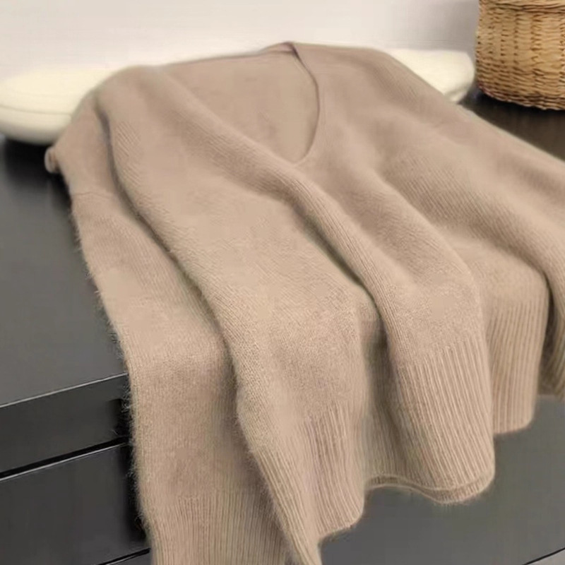 YUNSHUはアライグマの柔らかいモチのvネックのニットの中で女性の秋冬のゆったりしている怠惰なセーターのプルオーバーをまねて上着を打ちます。