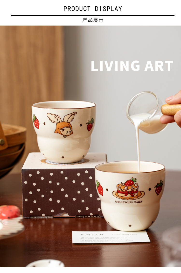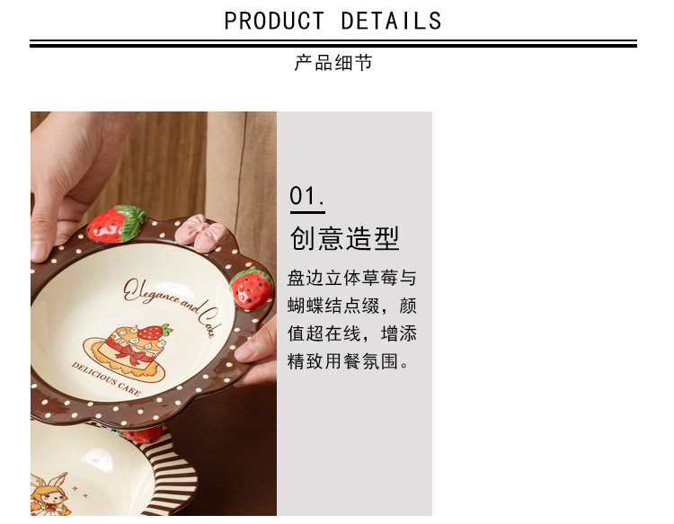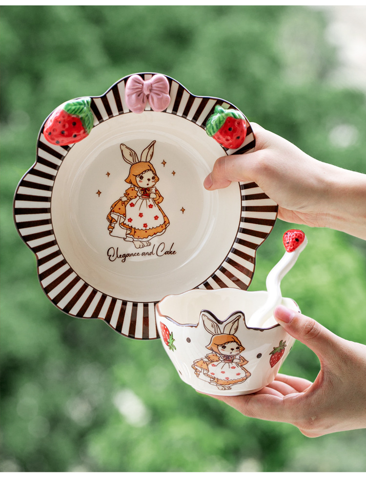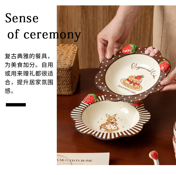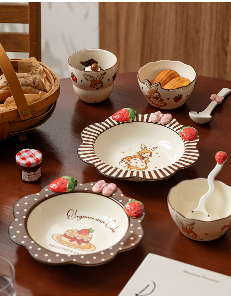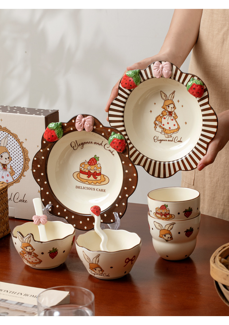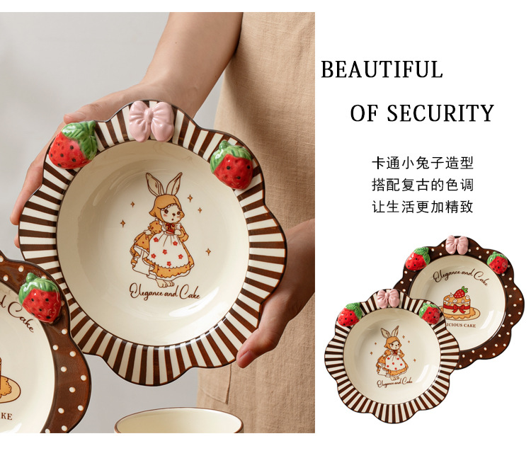 レトロなセラミックプレート、イチゴウサギの食器、家庭用皿、ボウル、箸、下絵付食器、スーププレート、丼、麺ボウル