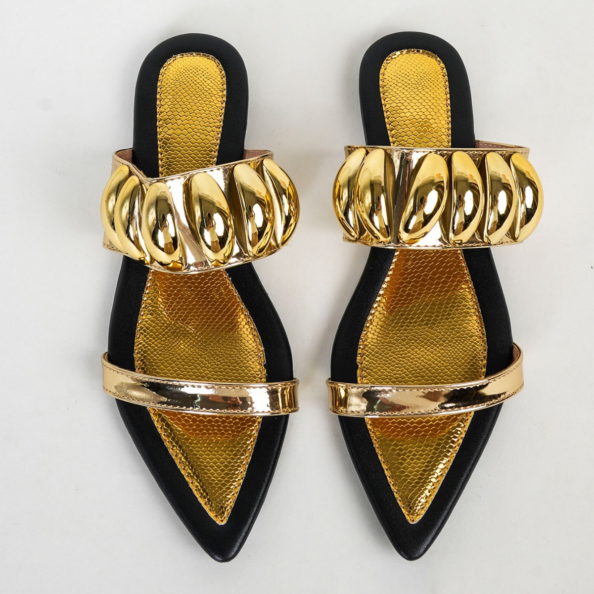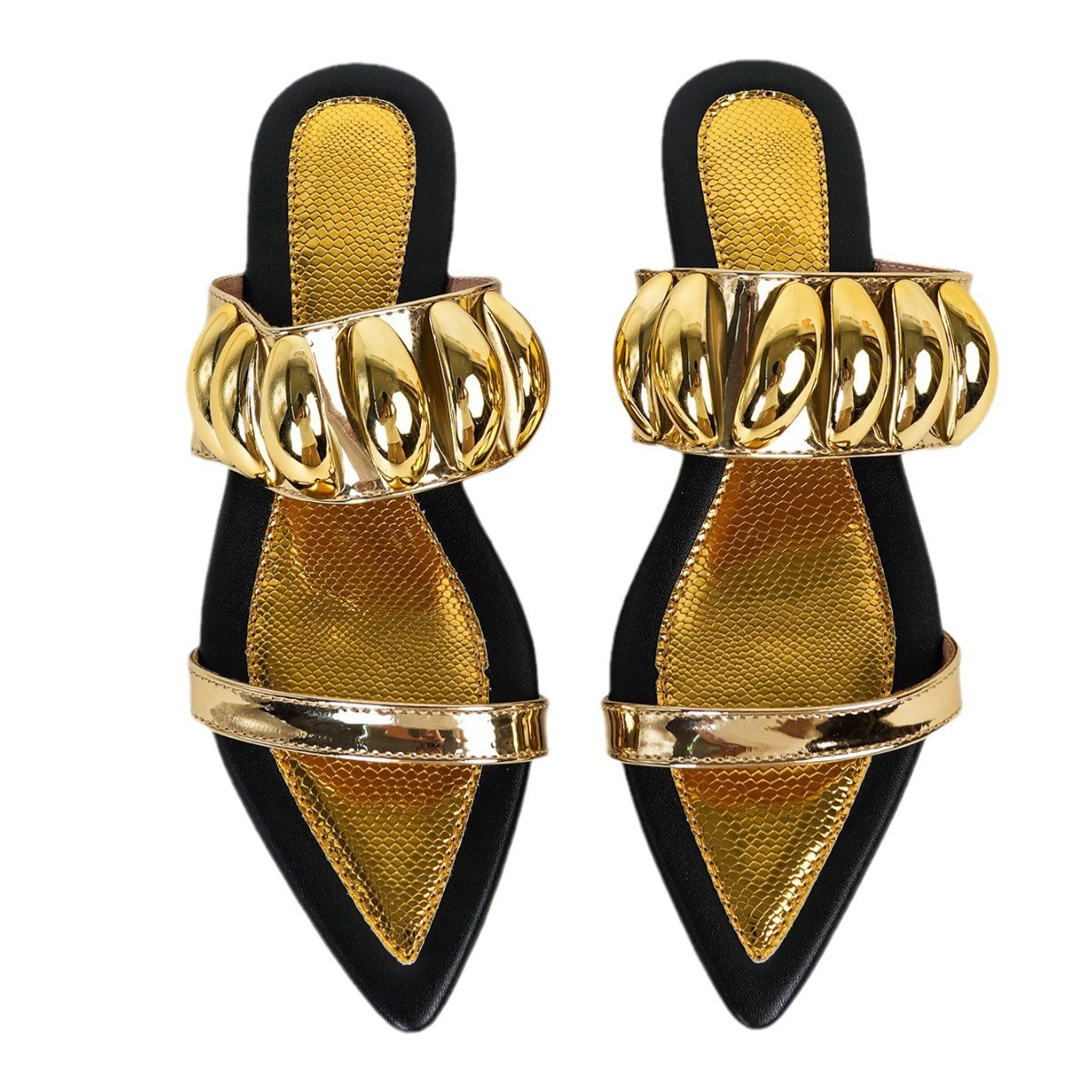 国境を越えた貿易女性用メタルジュエリーアクセサリー、快適なスクエアトゥ滑り止めフラットスリッパ、ドロップシッピングメタルデコレーション