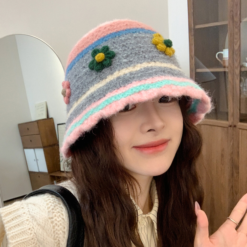 秋冬季新款彩色条纹时尚毛线帽子女款甜美百搭轻奢加厚保暖渔夫帽
