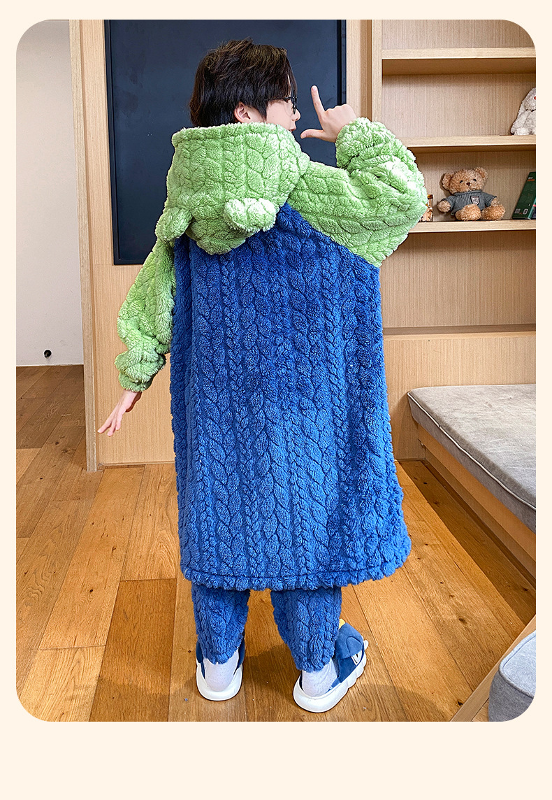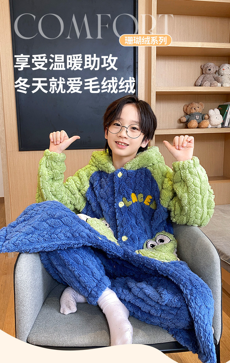 男童睡袍冬天法兰绒加厚长款浴袍浴巾保暖珊瑚绒大儿童家居服套装