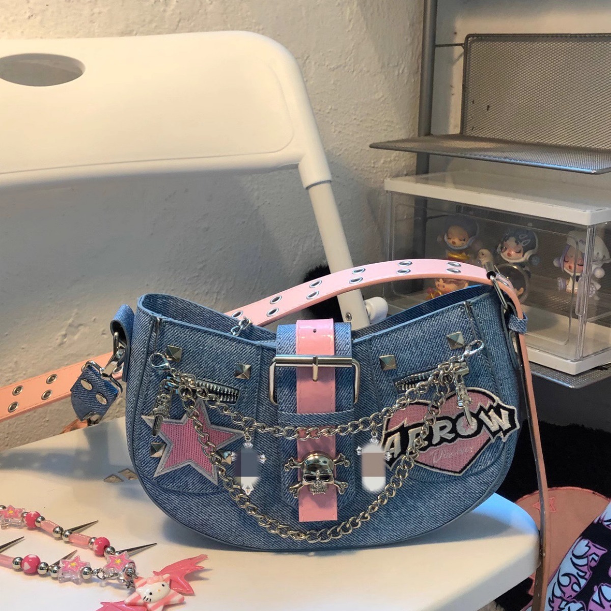 ピンクのバービーの女の子の個性的なデニムの斜めのショルダーバッグy 2k亜文化の個性的なハンドバッグ