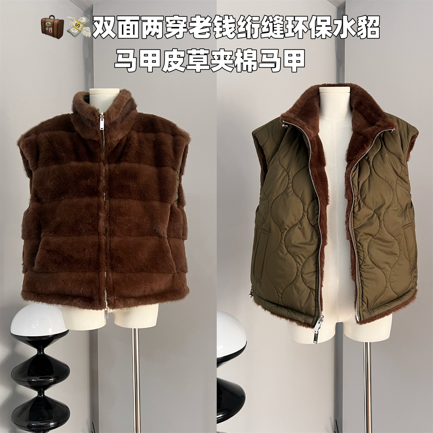 冬奢暖双面两穿老钱立领造型拉链绗缝环保水貂马甲皮草夹棉马甲