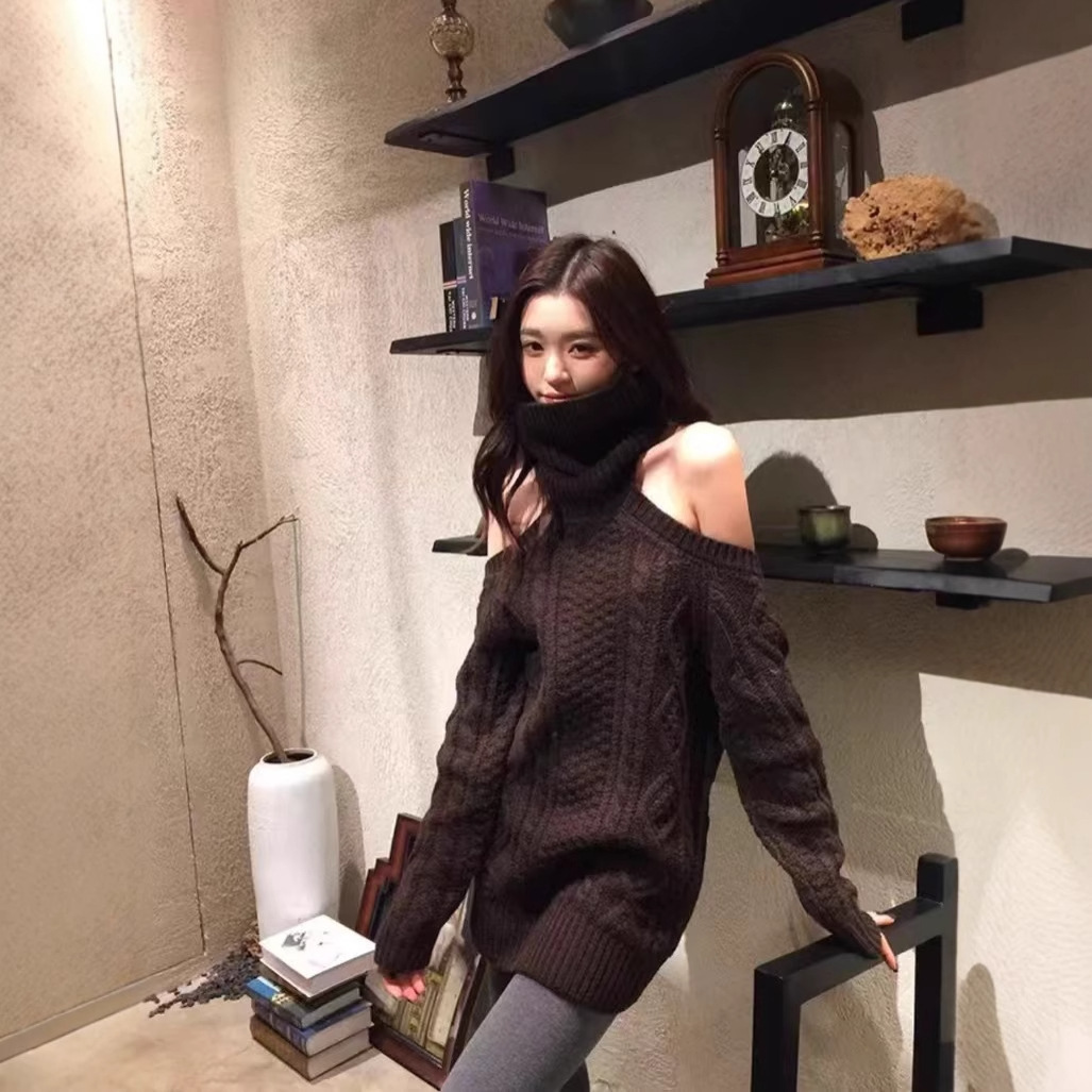 2025年の春の新型の気質のお姉さんの風の高い襟の肩のニットの女性の小さい大衆の設計感の麻花のセーター