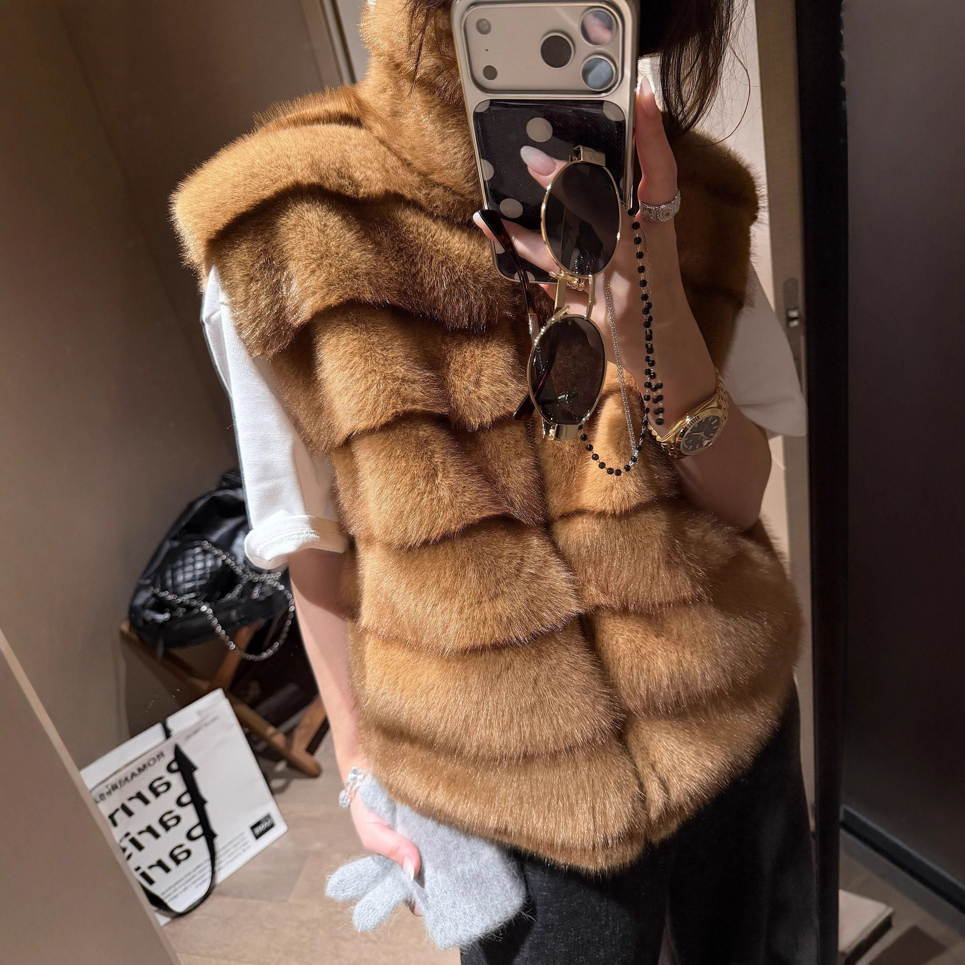25秋冬新作 コーヒー色のフェイクミンクファー 多用途カジュアルリバーシブルベスト 冬用厚手ダウンベスト レディース