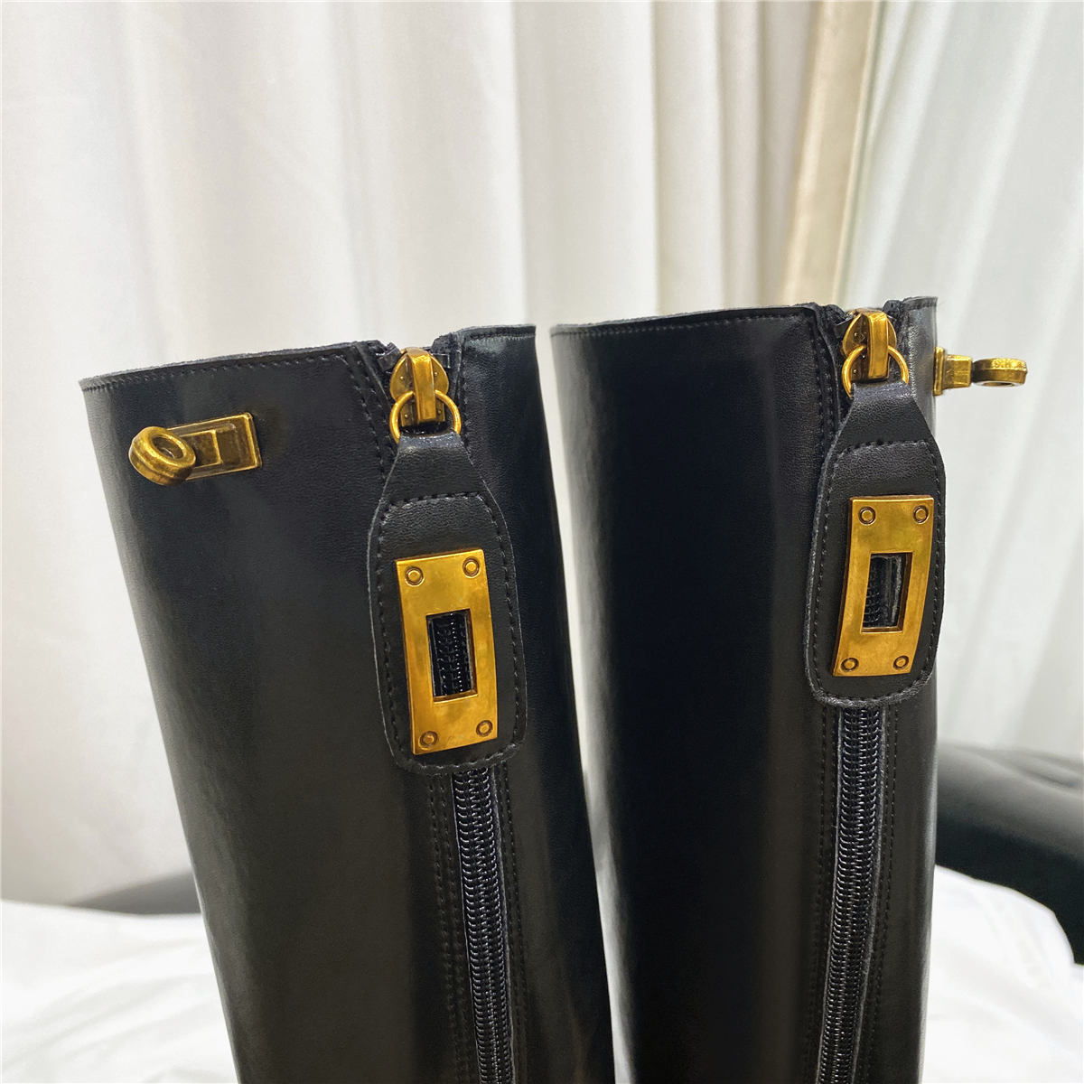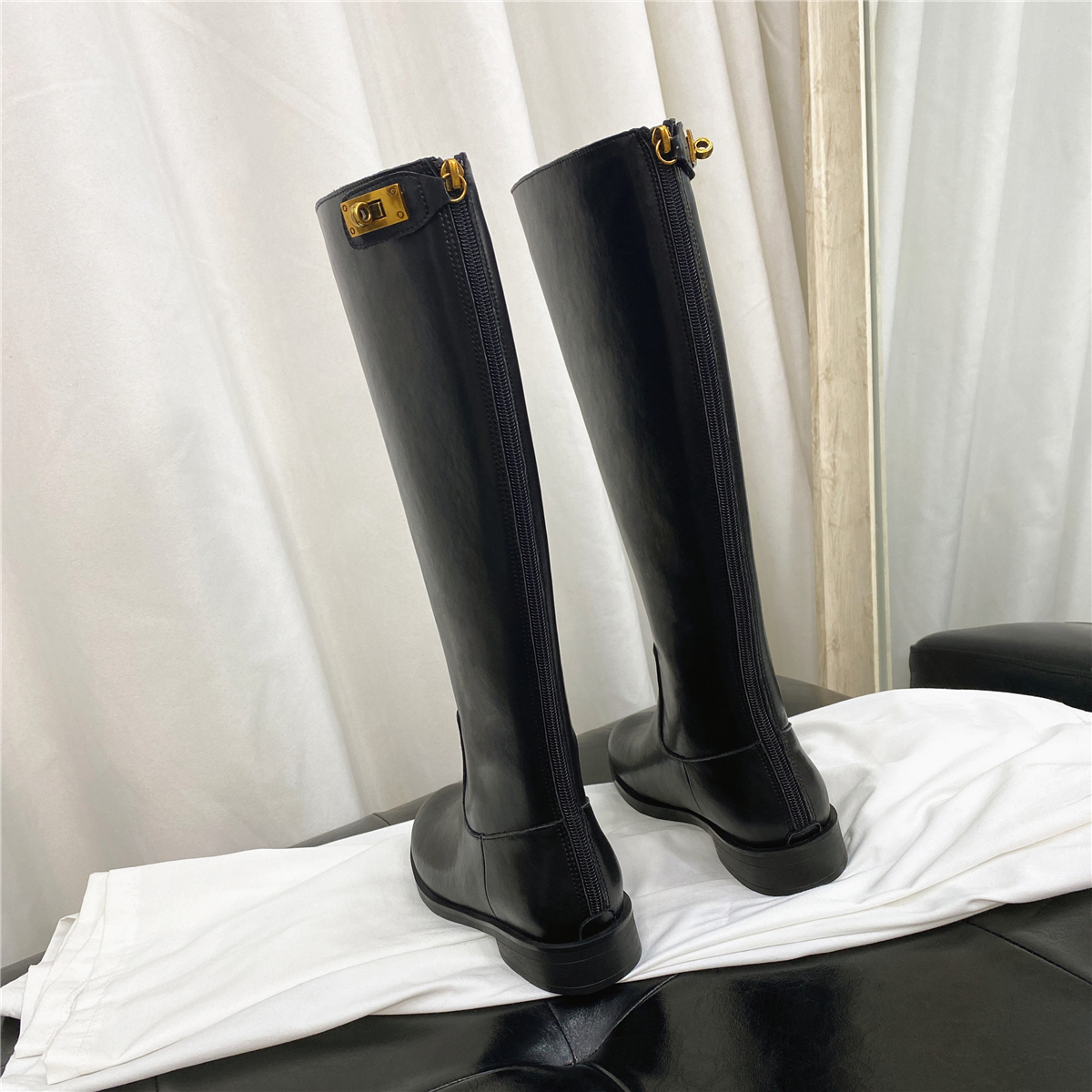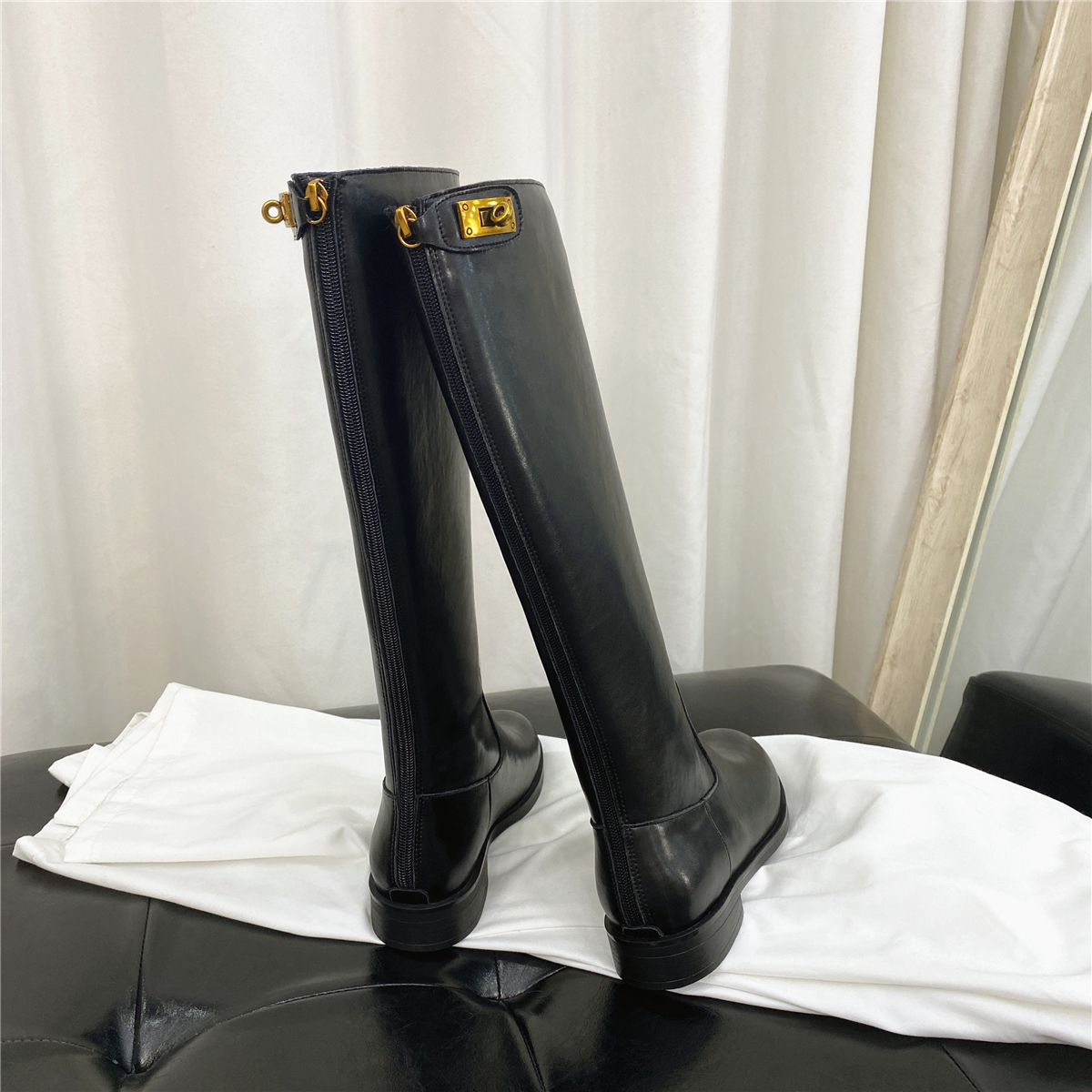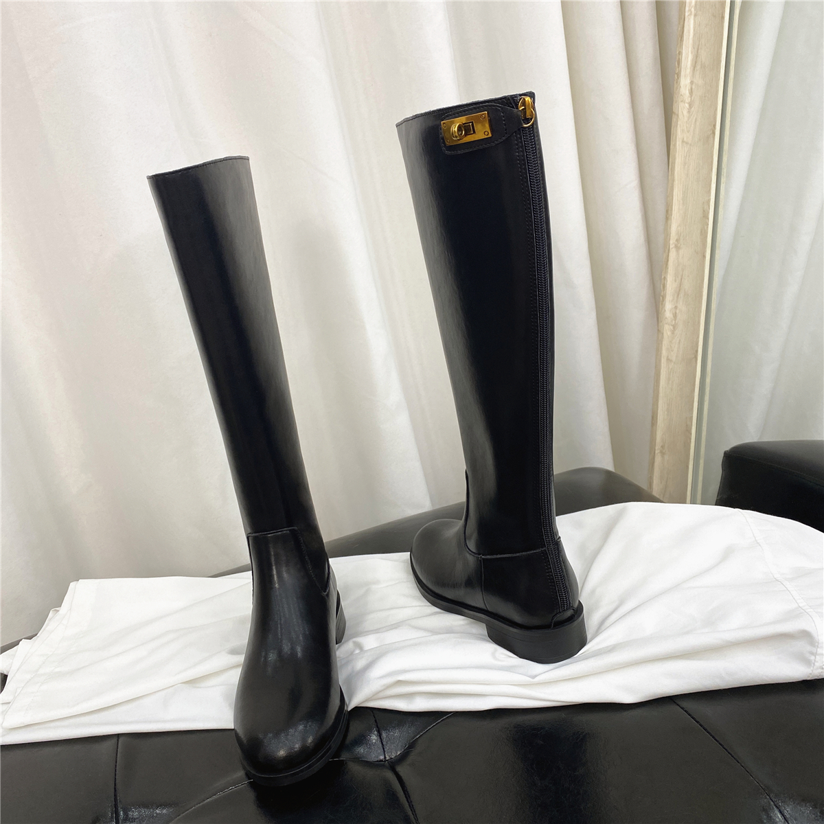 牛革バージョン~女性用本革フラットブーツ、小さなゴールドバックルハイライダーブーツ、太いヒール、膝丈ブーツ