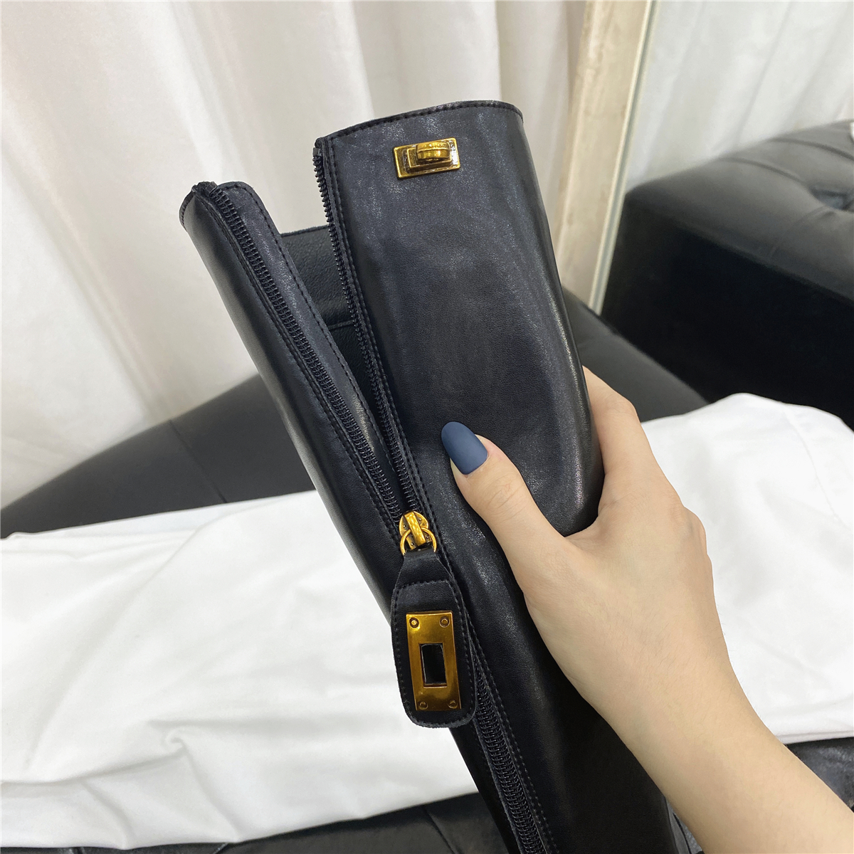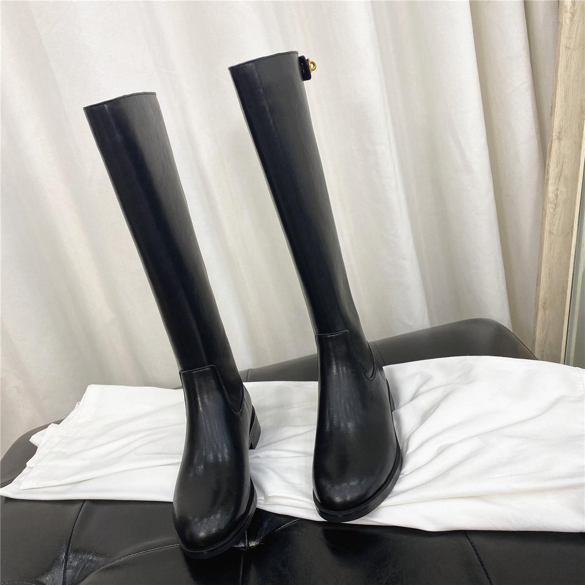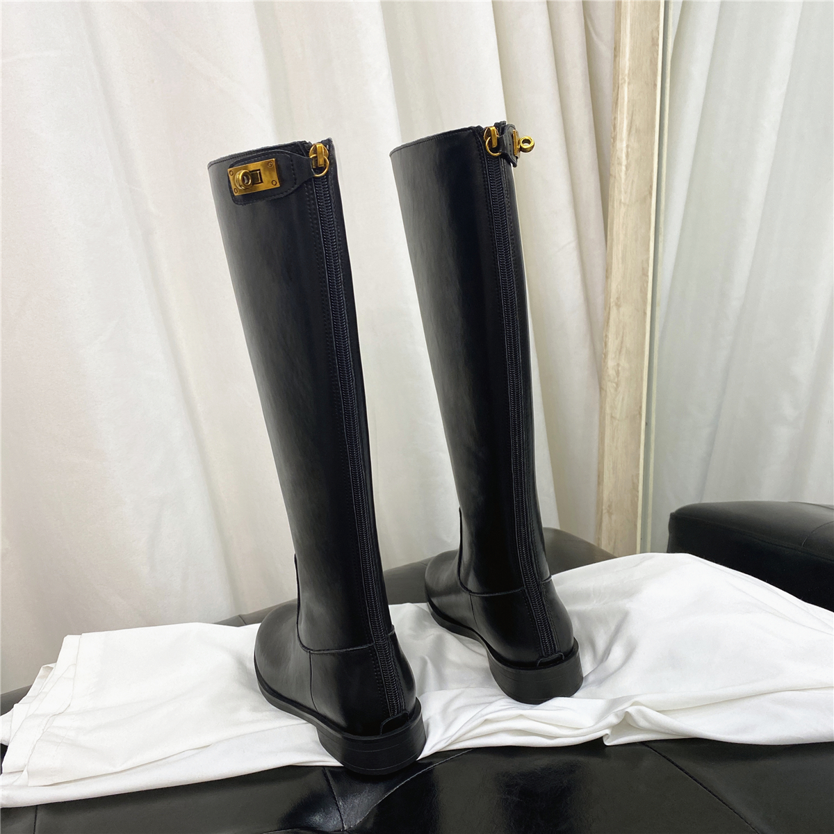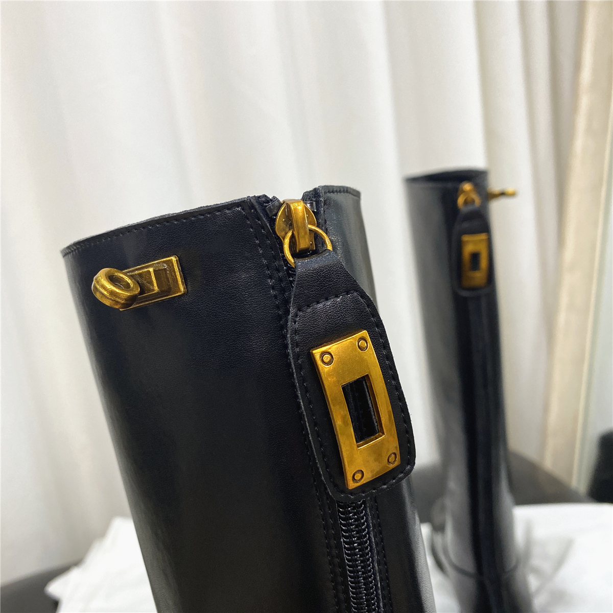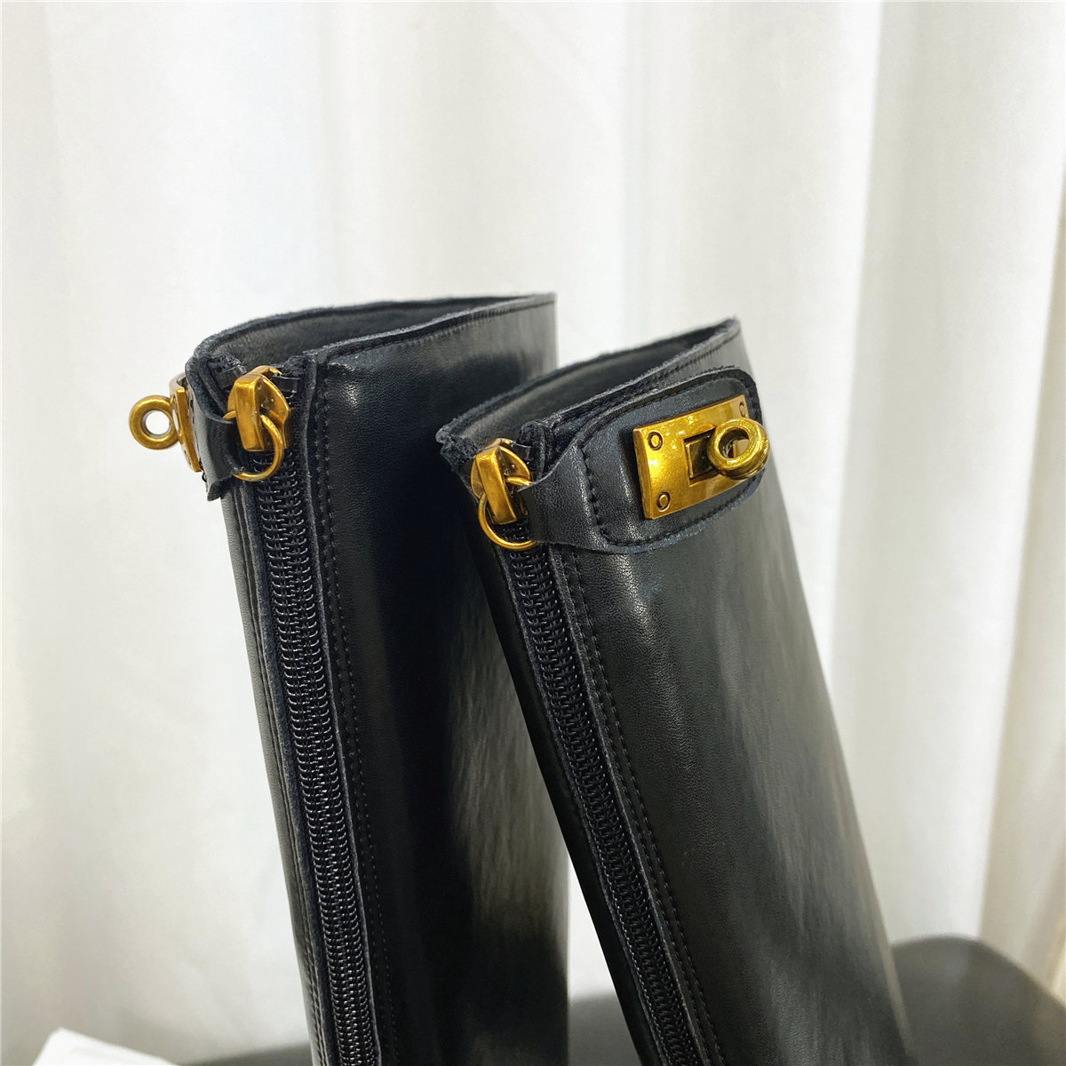 牛革バージョン~女性用本革フラットブーツ、小さなゴールドバックルハイライダーブーツ、太いヒール、膝丈ブーツ