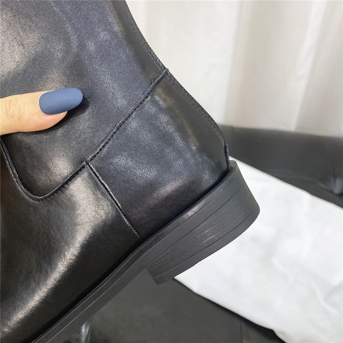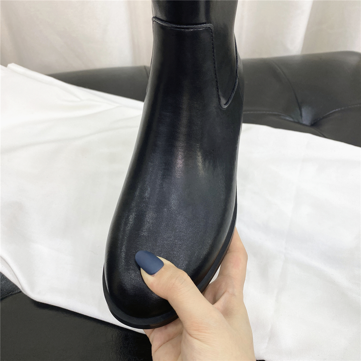 牛革バージョン~レトロプリーツミッドカーフブーツレディース厚底ラウンドトゥスリムブラックショートブーツストレートウエスタンブーツナイトブーツ