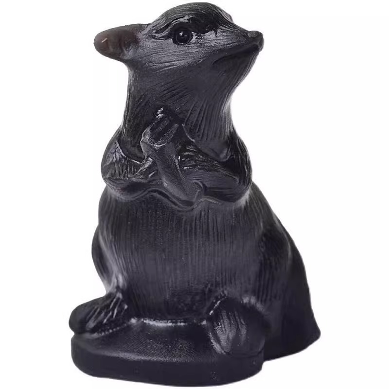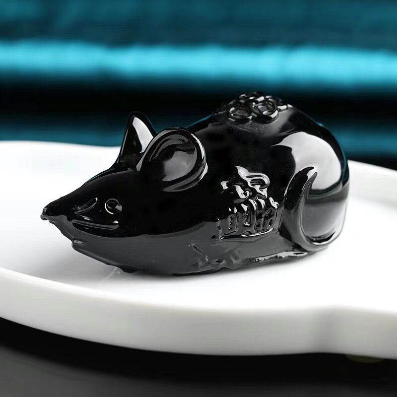 生肖大老鼠本命年吉祥物摆件天然水晶黑曜石原石雕刻鼠 家居装饰