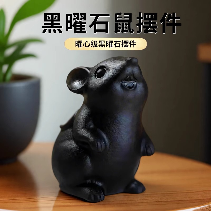 天然黑曜石生肖老鼠摆件家居办公室吉祥物黑色水晶石雕刻摆件饰品