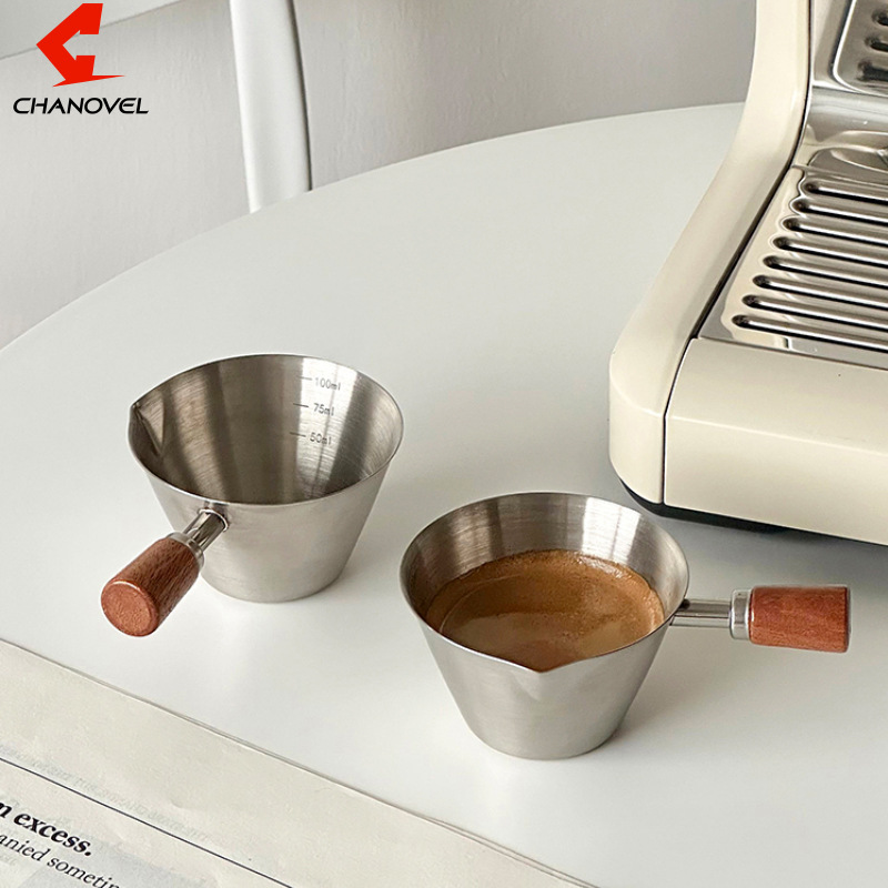 跨境304不锈钢萃取杯 胡桃木柄意式浓缩咖啡量杯带刻度接液盎司杯