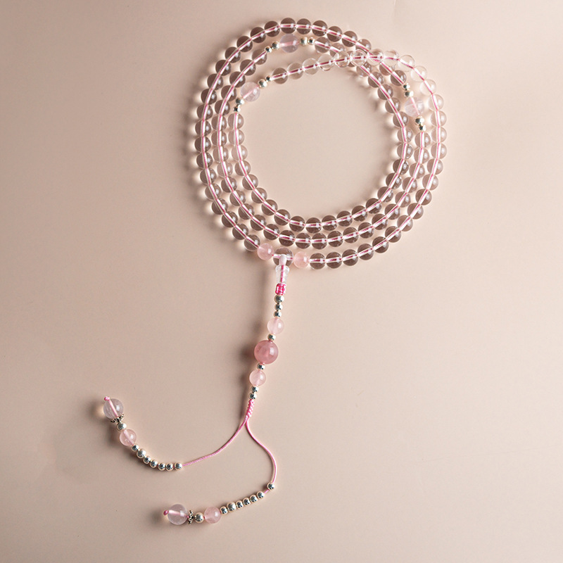 天然の白い水晶のブレスレットとピンクの水晶の108個の仏珠の多い毛のチェーンの男女の金の復古の手の串