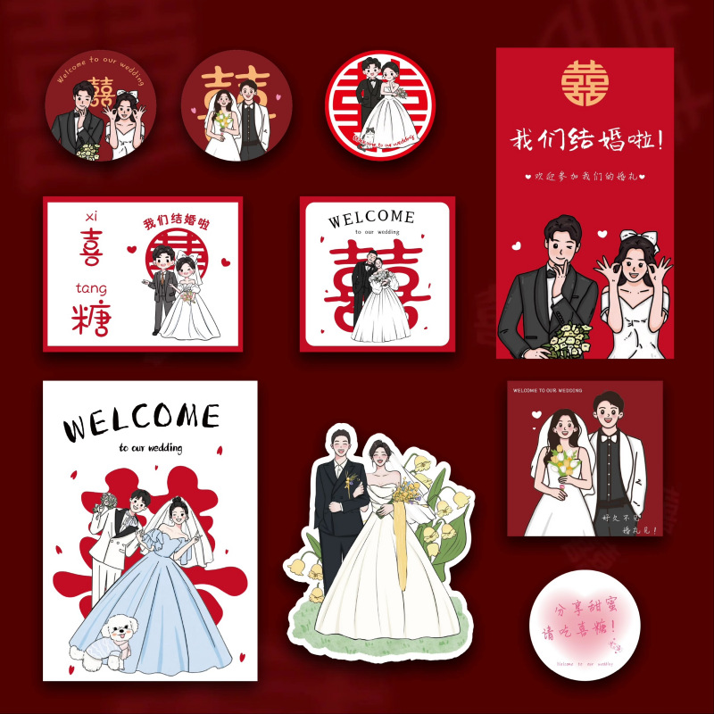 结婚装饰可爱插画风格现货贴纸喜茶包装通用喜糖封贴婚礼备婚