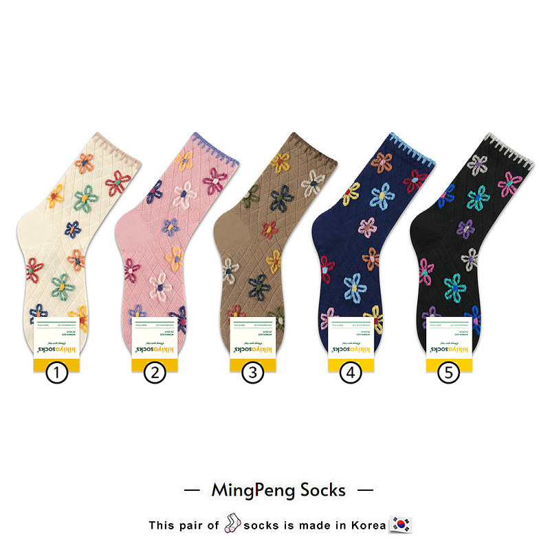 韓国レディース中筒綿ソックス東大門kikiya秋新作レリーフ小花レトロ植物フラワーカジュアルソックス