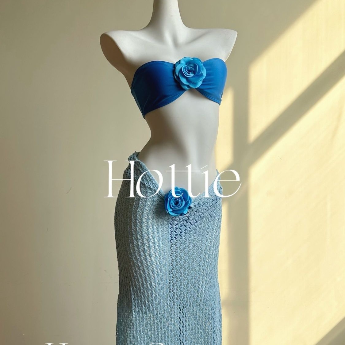 タイの雰囲気感ブルーニットブラウス花ビキニ三点セット海島リゾート温泉水着女夏