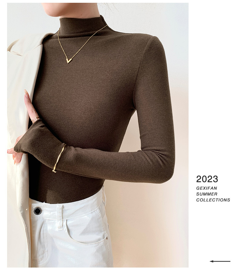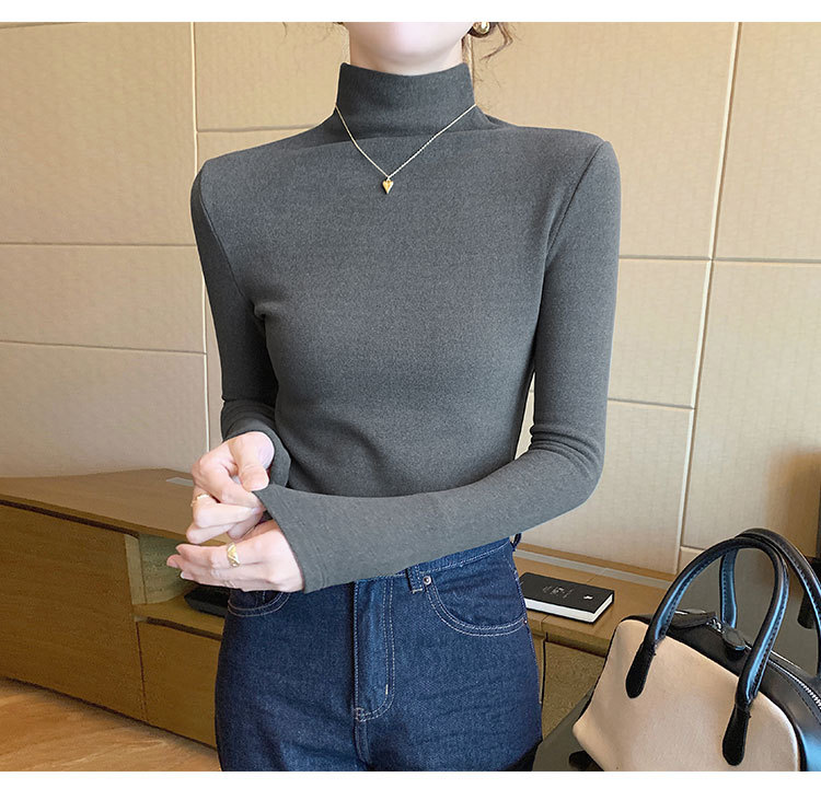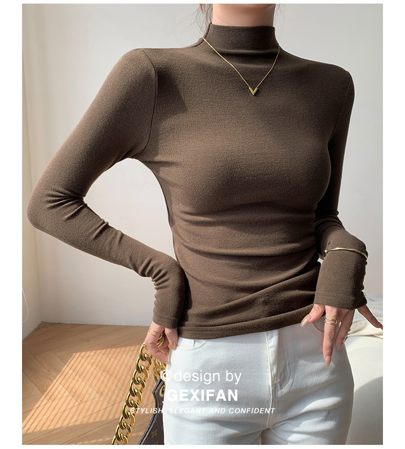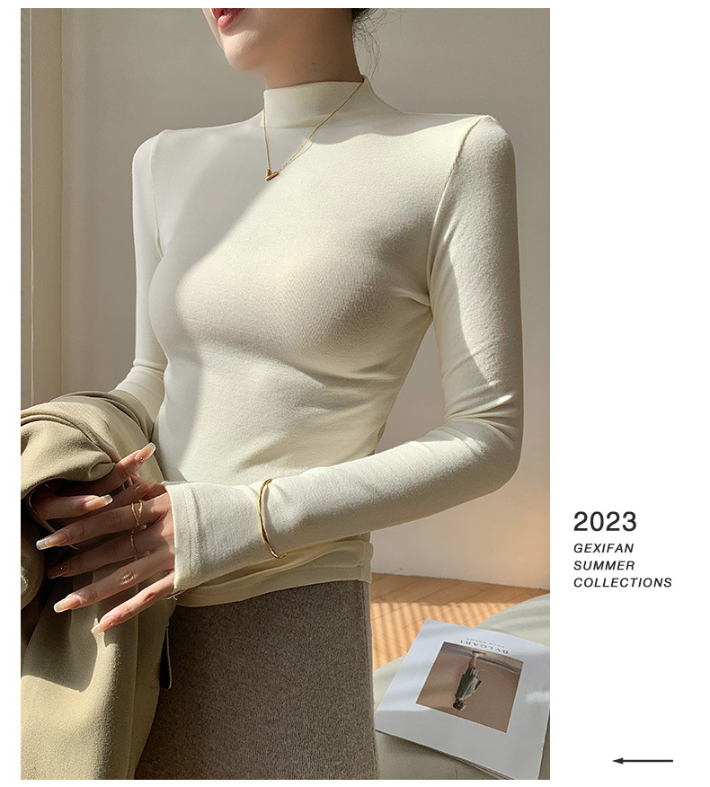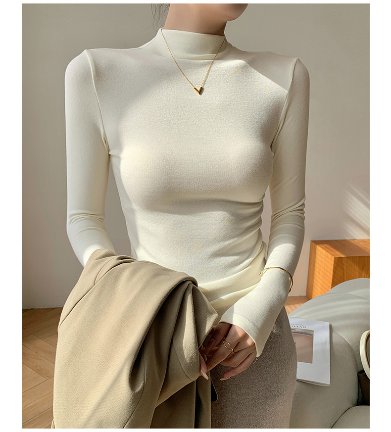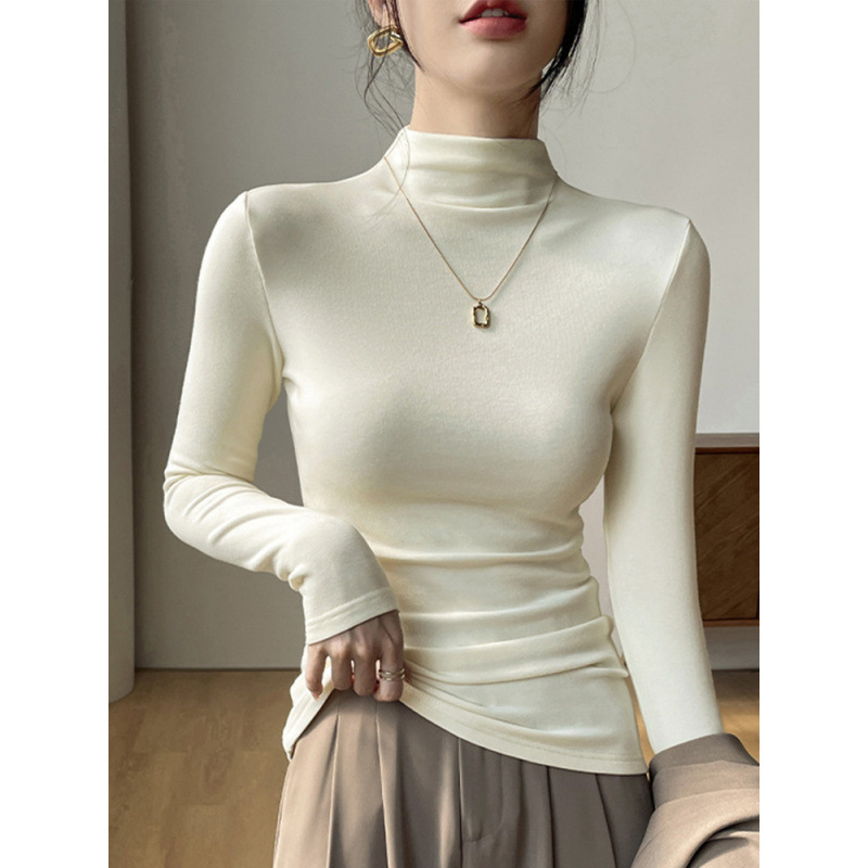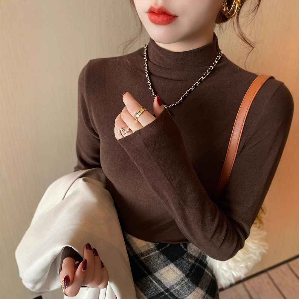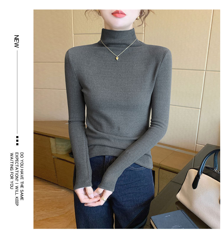 杏色の半高襟の底のシャツの女性の中に2024秋冬の洋風の黒色の長袖のtシャツの徳毛のベルベットの上着の潮を掛けます。