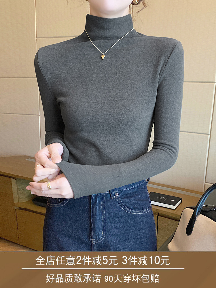 杏色半高领打底衫女内搭2023秋冬洋气黑色长袖t恤德绒加绒上衣潮