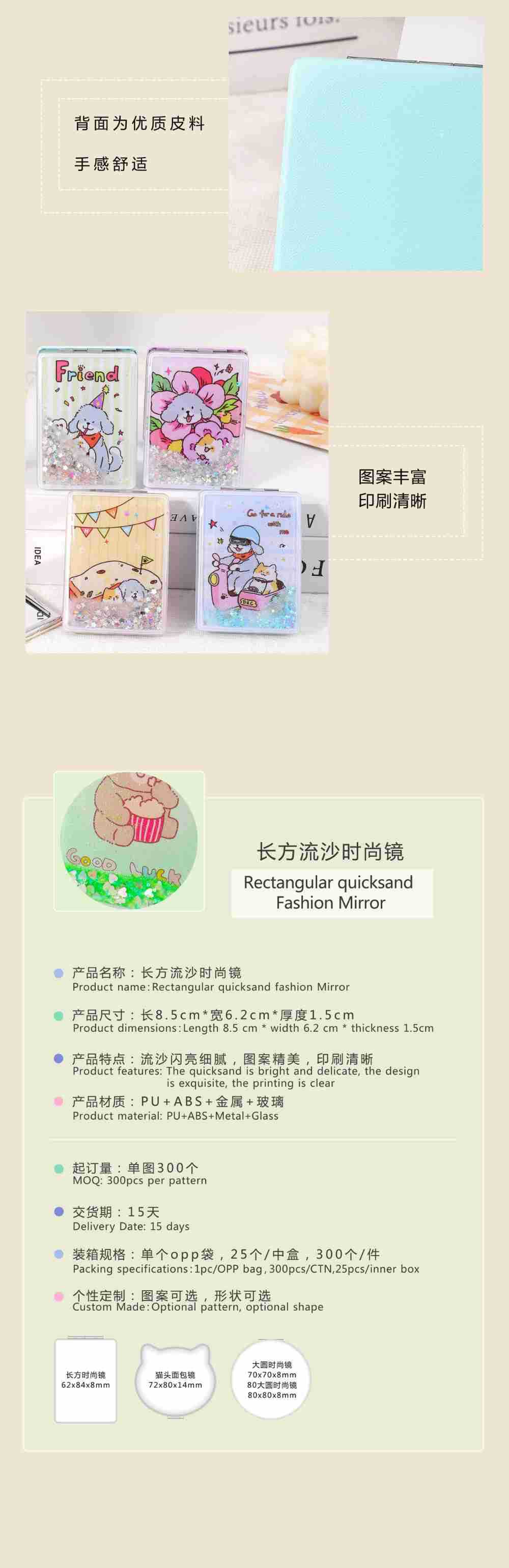 ファッショナブルでクリエイティブなファッショナブルな長方形流砂化粧鏡流砂中間層小型ミラーポータブルミラー美容ミラー写真付き