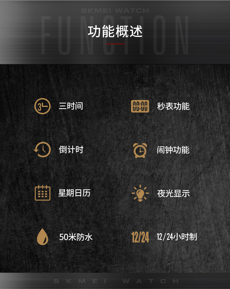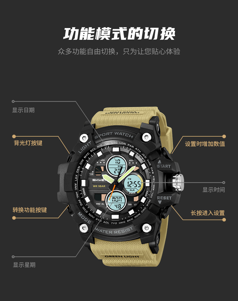 功能:3时间、秒表计时、日期、定时响闹、星期、EL夜光、整点报时、12/24小时制、倒计时。