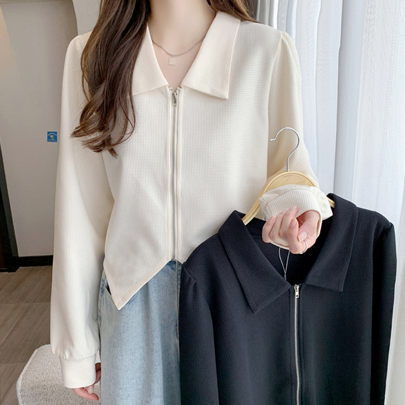 大きいサイズの女性の秋の服の正肩の長袖のtシャツは不規則にやせている上着の太っている妹のファスナーを編んで腰の底のシャツを収めます。