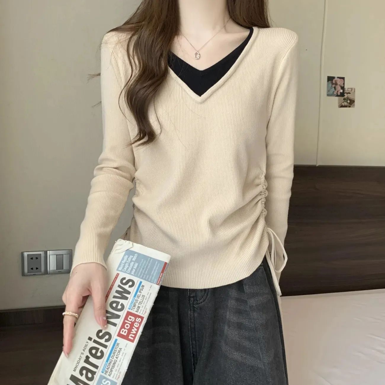 假两件长袖t恤女春秋新款设计感撞色V领修身显瘦内搭打底小衫上衣