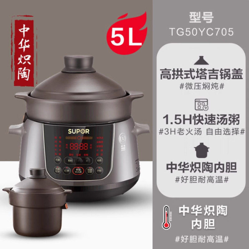 蘇泊爾電気シチュー鍋中華熱陶家庭用スープ多機能知能予約電気土鍋TG50YC705
