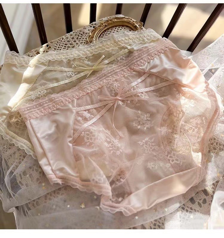 无痕缎面蕾丝内裤女士内衣裤日系少女款优雅蝴蝶结中腰三角裤