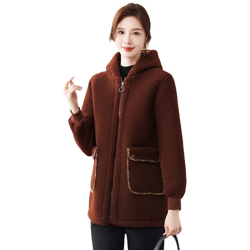 お母さんの冬の服の粒の毛のコートは帽子とベルベットの厚い綿の服の新型の中高年の婦人服をつけて羊の小毛のカーディガンをまねます。