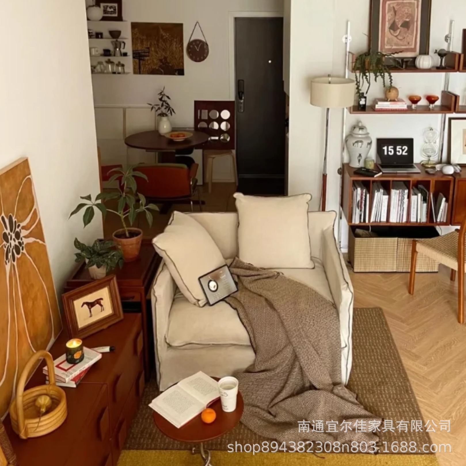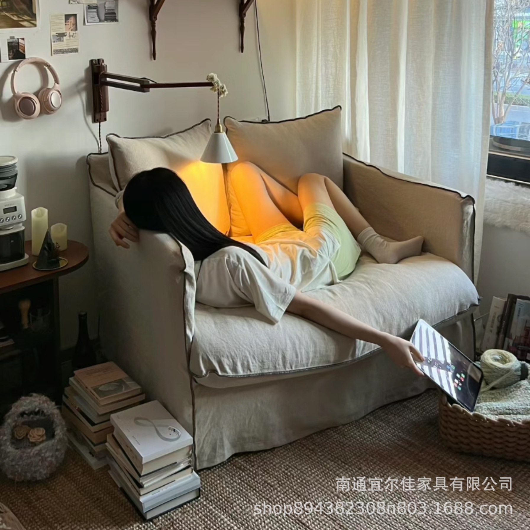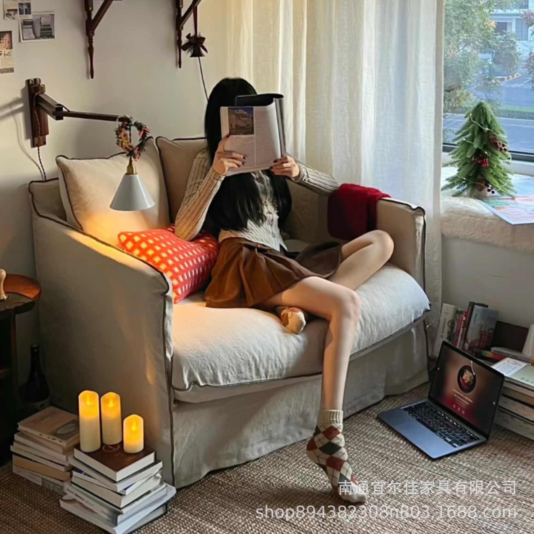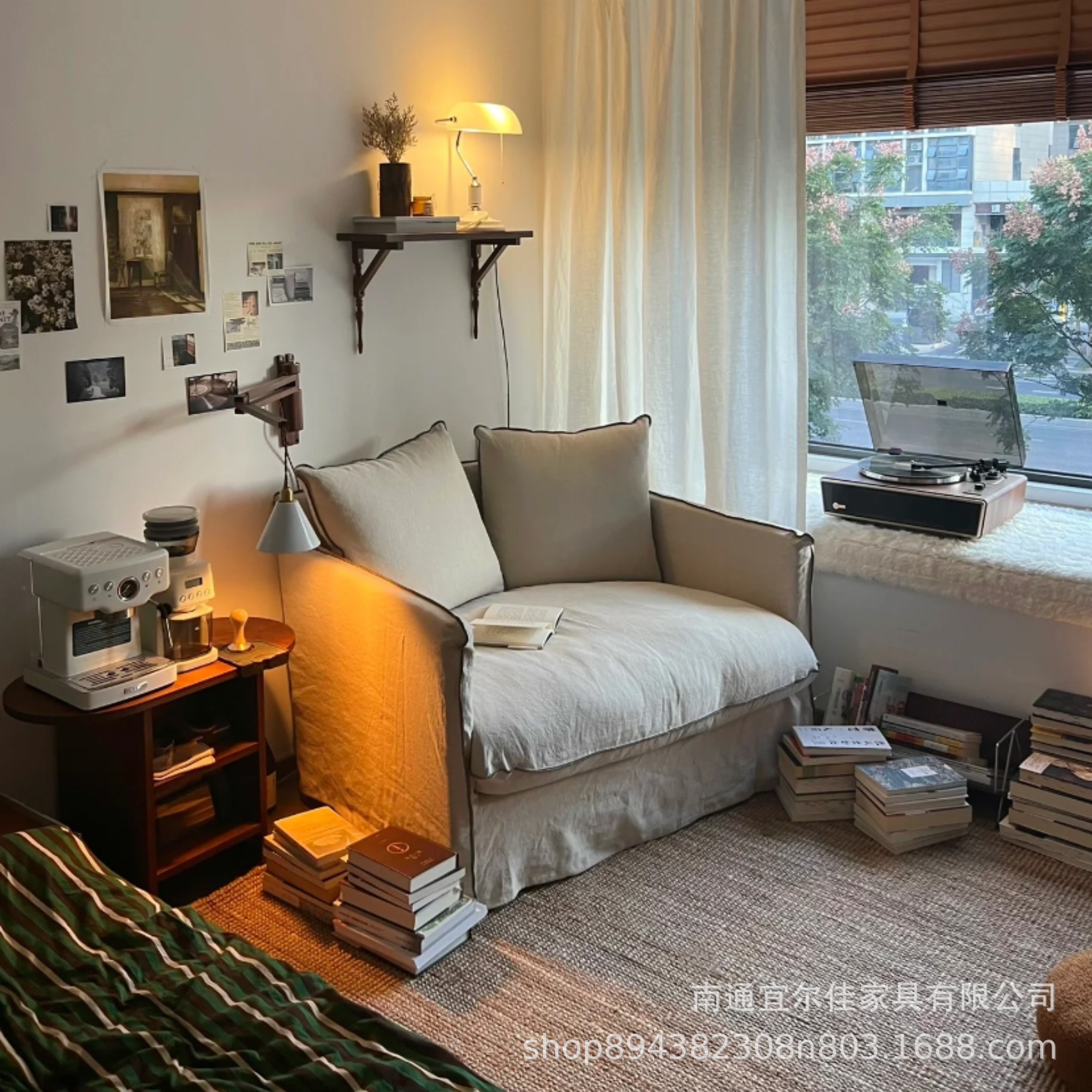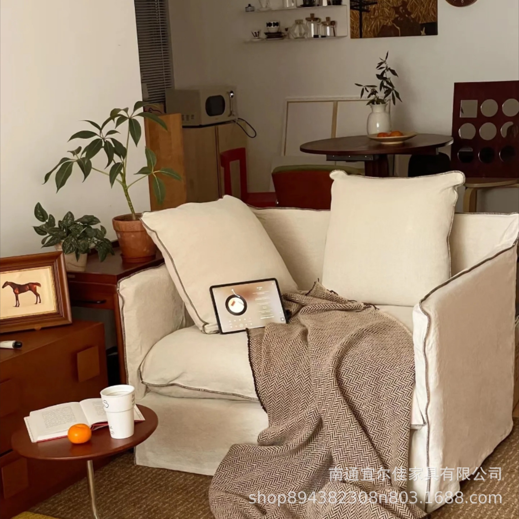 侘び寂び風、取り外し可能で洗えるシングルソファ、クリーム系、小スペース向け、リネン、シンプル、リビングルーム、羽毛布地、綿麻ソファ