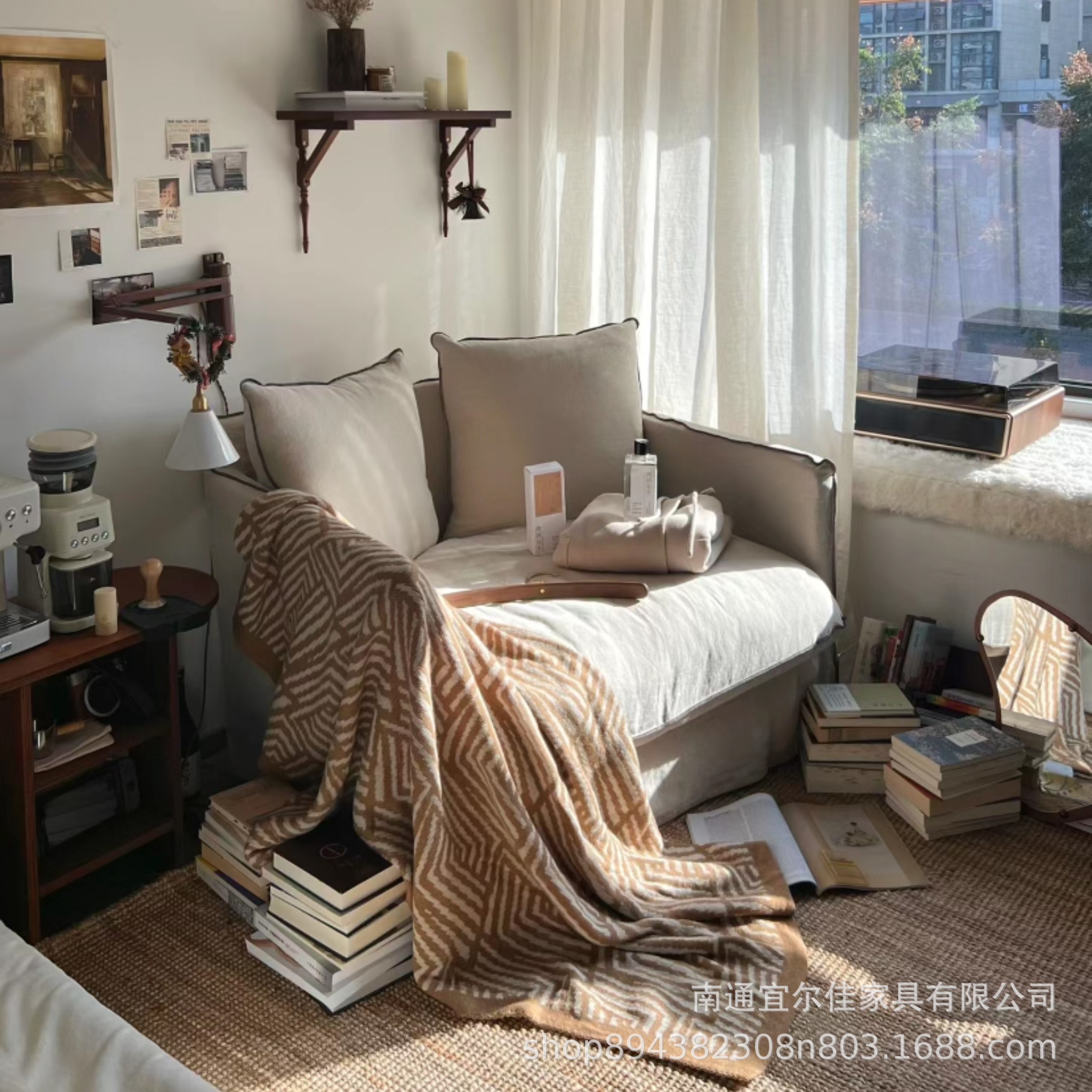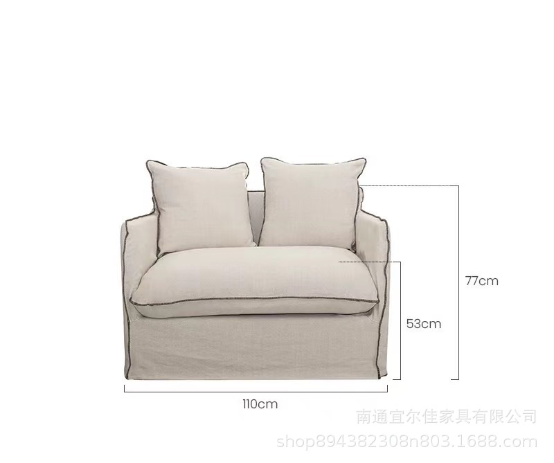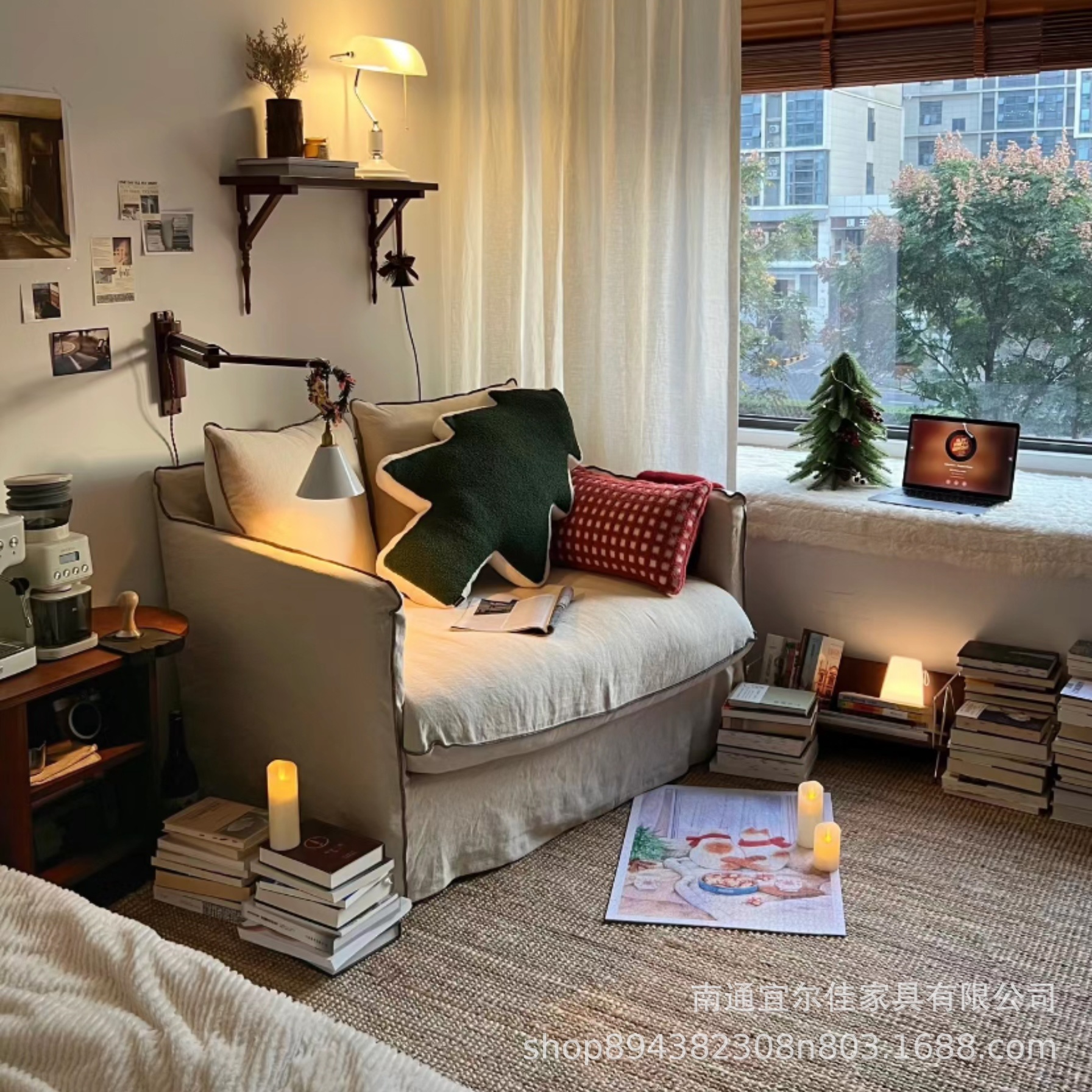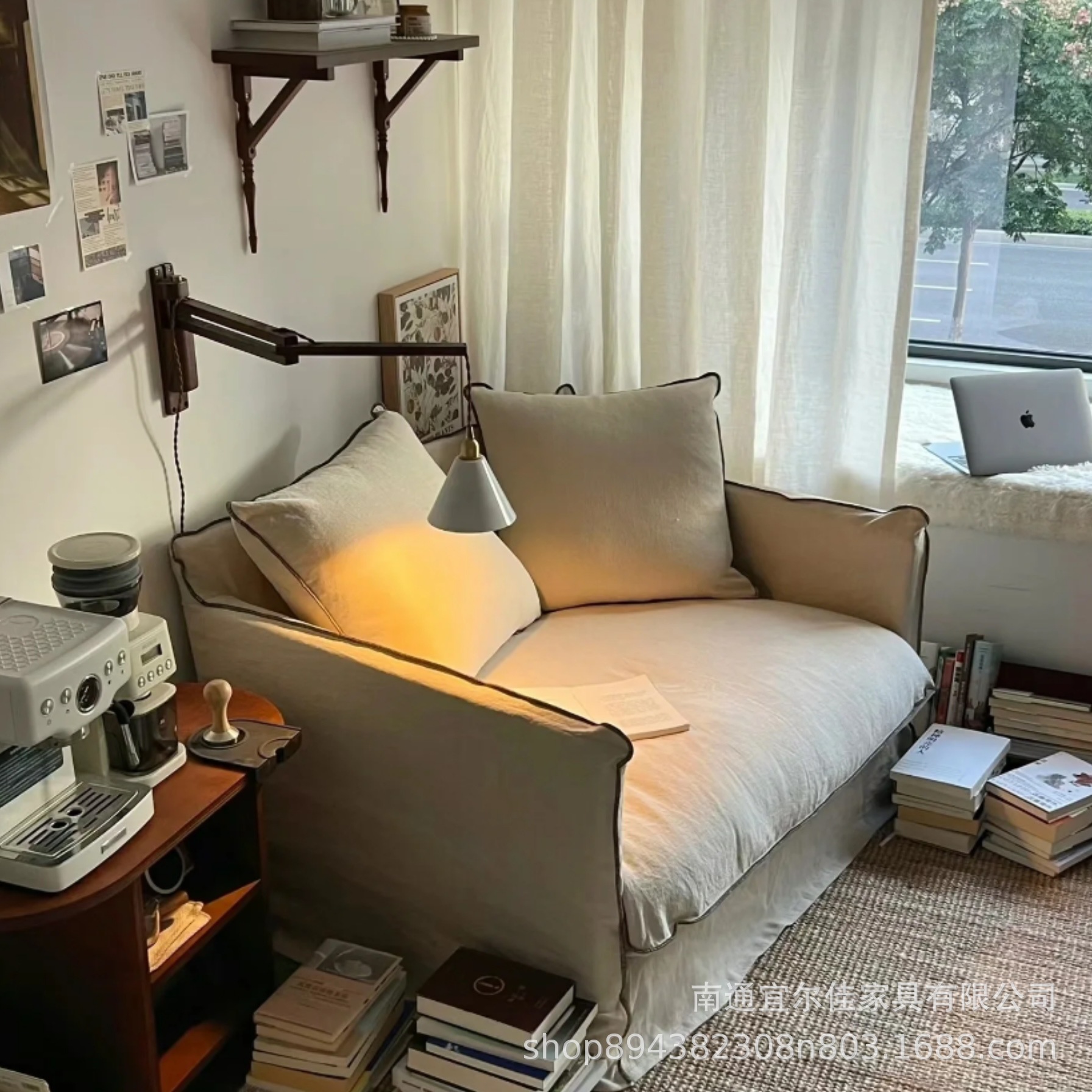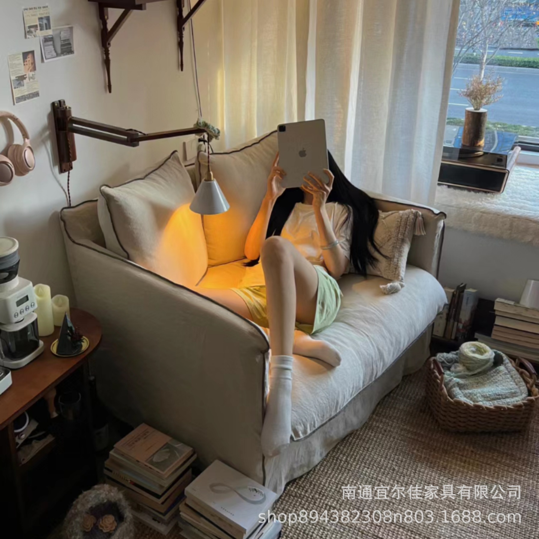 侘び寂び風、取り外し可能で洗えるシングルソファ、クリーム系、小スペース向け、リネン、シンプル、リビングルーム、羽毛布地、綿麻ソファ