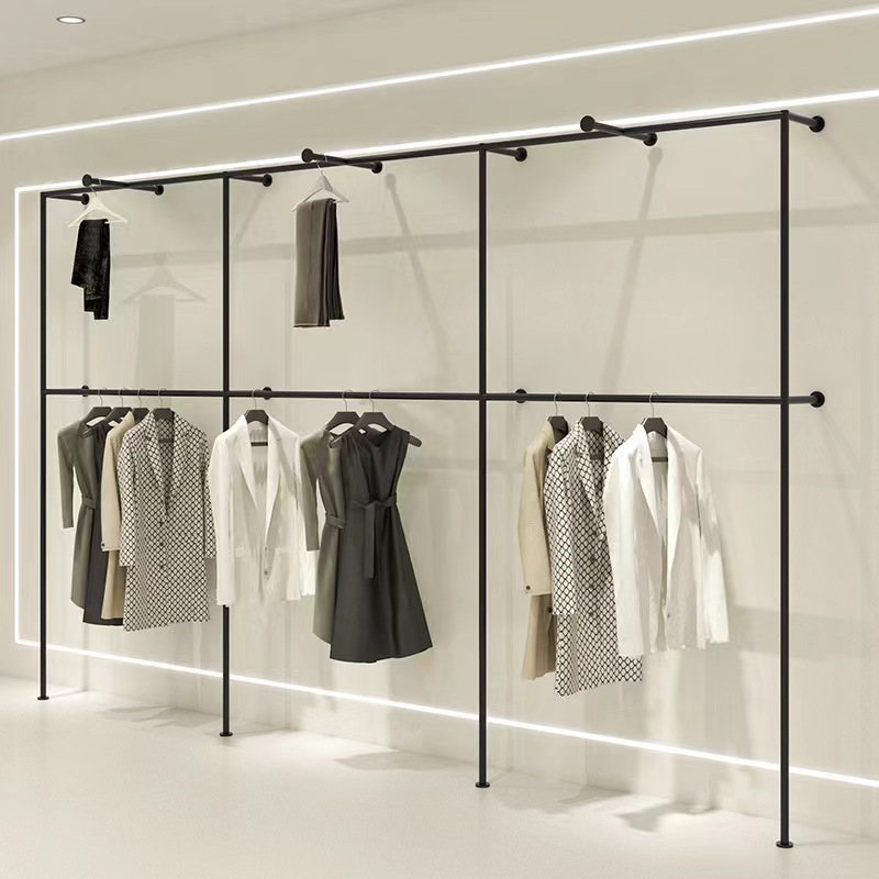 男性婦人服店二重ハンガー床置きステンレス塗装黒上壁陳列棚洋服店展示棚
