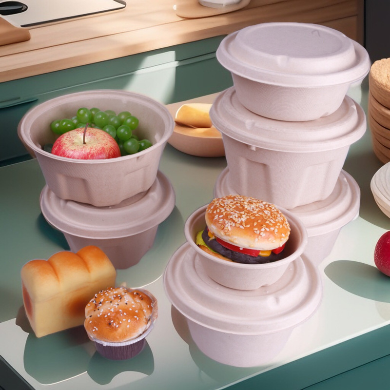 国境を越えた使い捨てパルプの丸い碗のサラダの包装箱の軽食の弁当箱の食品は屋台の弁当箱を並べて脂肪を減らします。