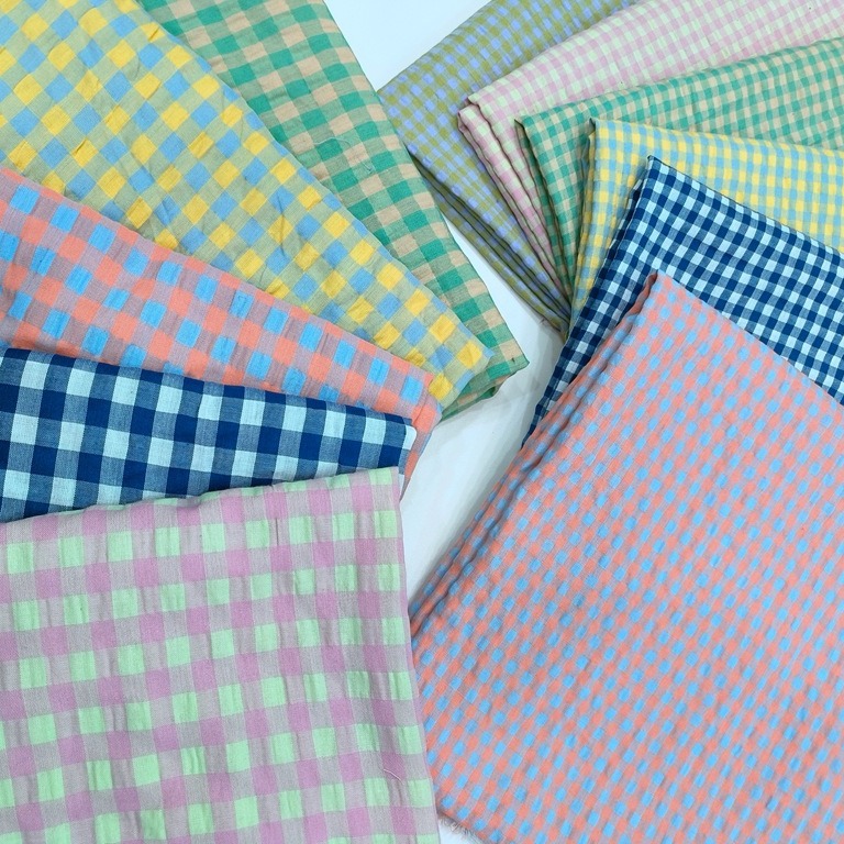 色織平織りポリエステル綿混紡バブルカラーカイシャオ格子柄生地、男女兼用シャツ、子供服、柔らかく通気性のある生地、卸売