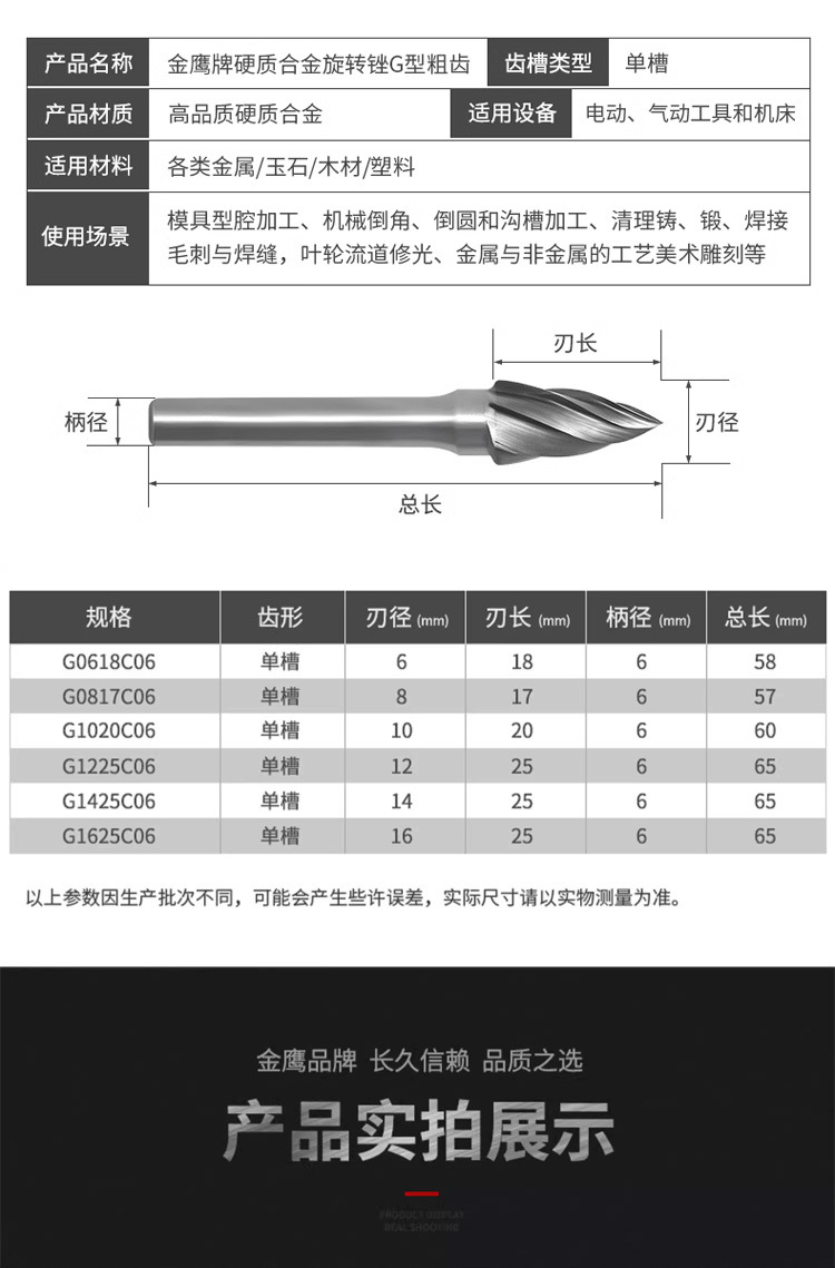 金鷹硬質合金回転やすりG型G1225 G1425粗幅歯鋭利タングステン鋼合金回転やすり6mm