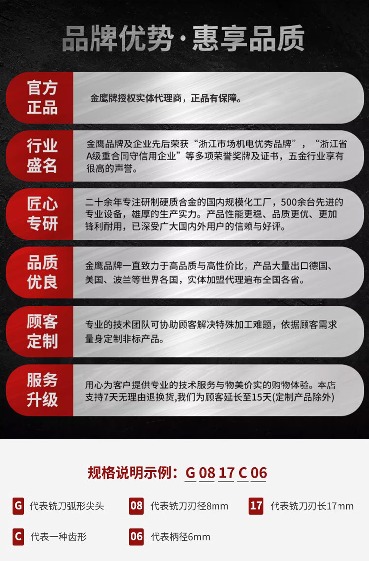 仕様 ゴールデンイーグル G0618C06 [刃径6mm 6歯],ゴールデンイーグル G0817C06 [刃径8mm 6歯],ゴールデンイーグル G1020C06 [刃径10mm 6歯],ゴールデンイーグル G1225C06 [刃径12mm 8枚歯],ゴールデンイーグル G1425C06 [刃径14mm 8歯],ゴールデンイーグル G1625C06 [刃径16mm 8歯]