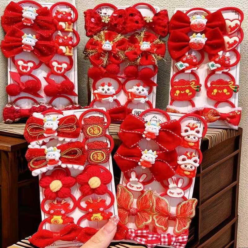 子供の皮の筋はとても赤くて、お祝いの春節は新年の髪飾りをします。