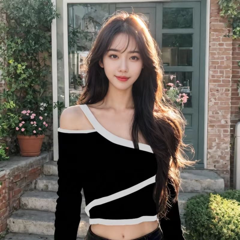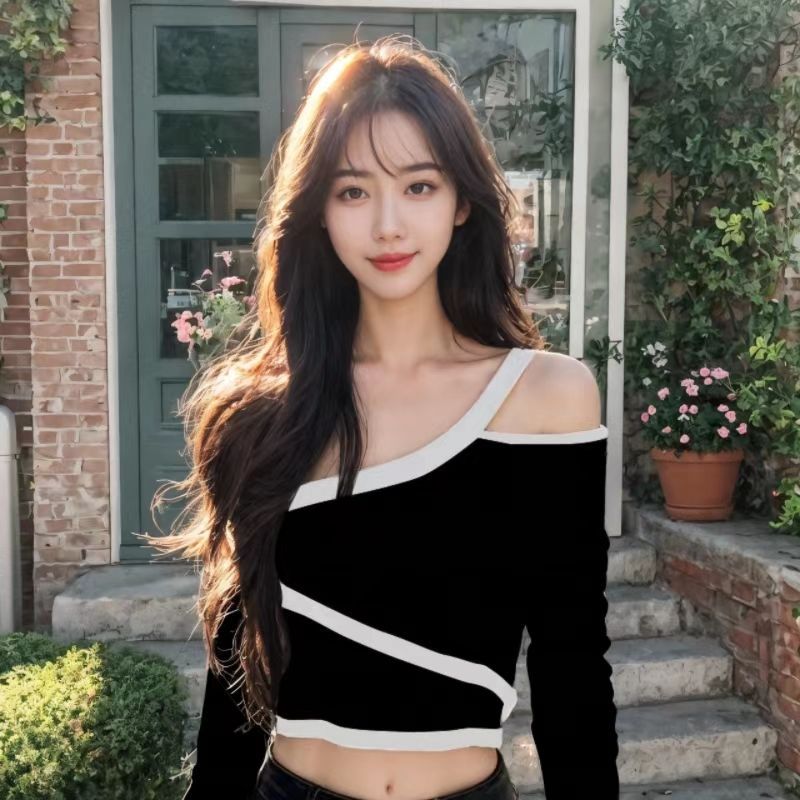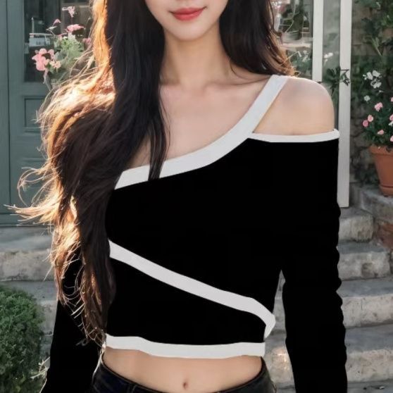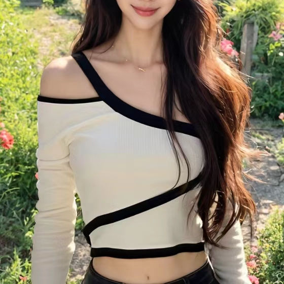 小衆のセクシーなギャルのinsは肩を露出して純粋に長袖のtシャツの女性の秋の修身が見えて痩せています。