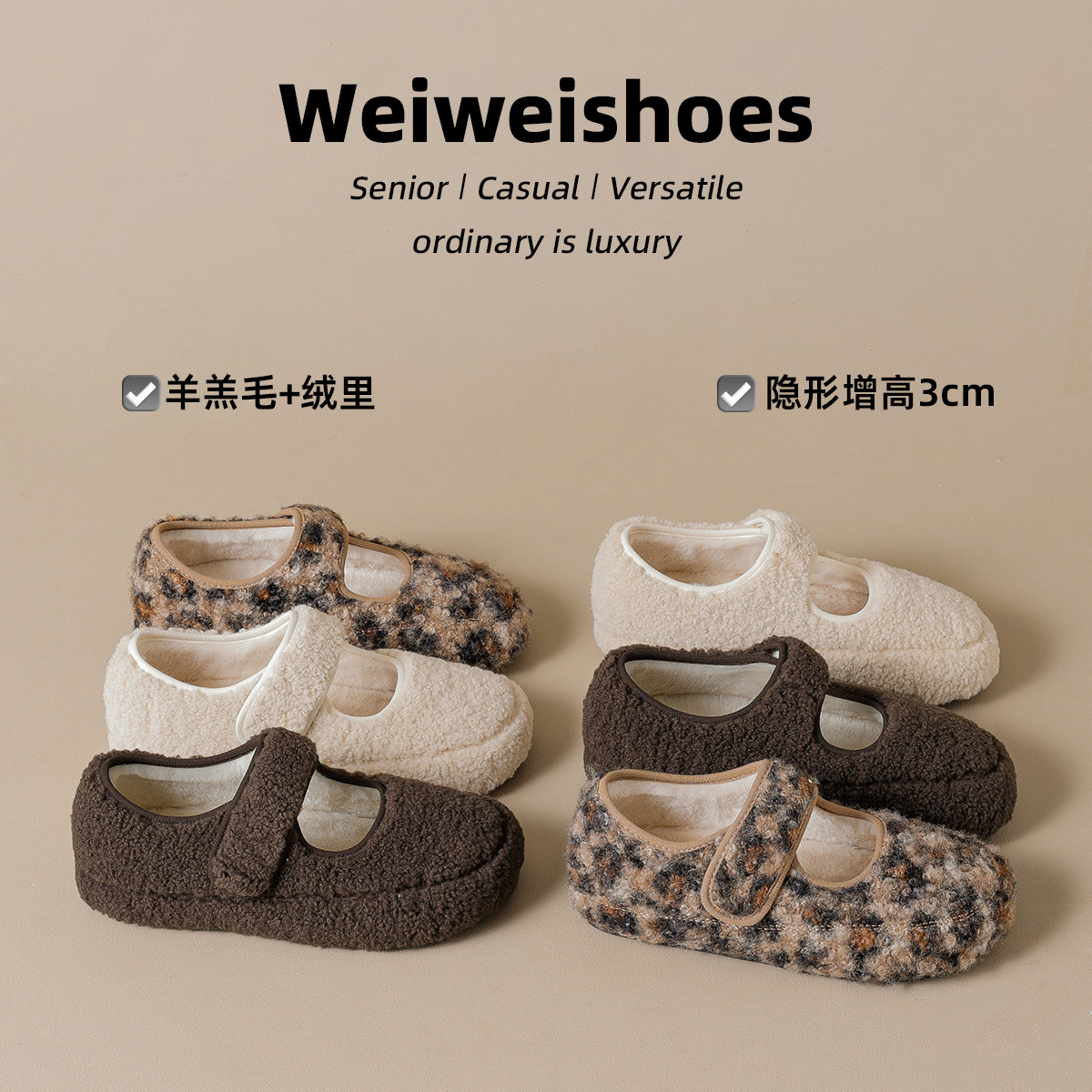 威威女郎 2852-8内增高豹纹玛丽珍毛毛鞋女冬季外穿单鞋加绒棉鞋