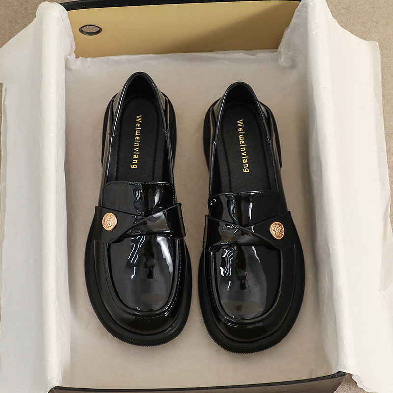 黒英国小さな革の靴の女性の厚底 2025 春の新スリッポン太いヒールローファーラウンドトゥ 2 着用女性の靴