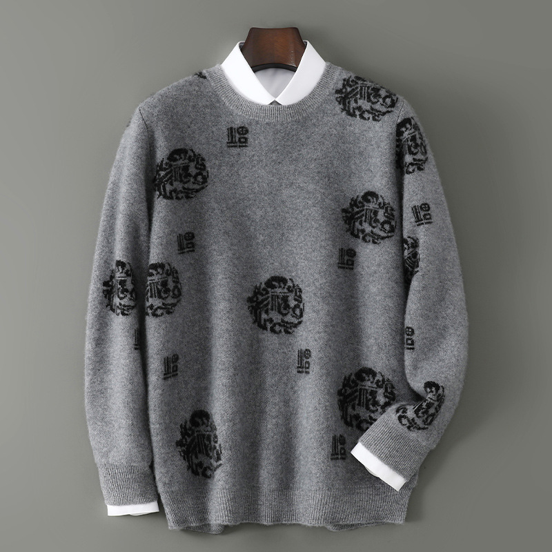 加厚福字提花时尚拼色羊毛衫男士秋冬打底纯羊毛衫圆领宽松中青年