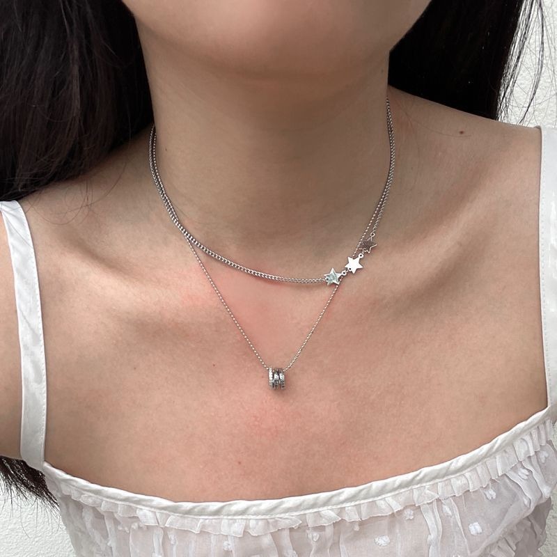 二重星はネックレスを重ねています。シンプルで個性的です。