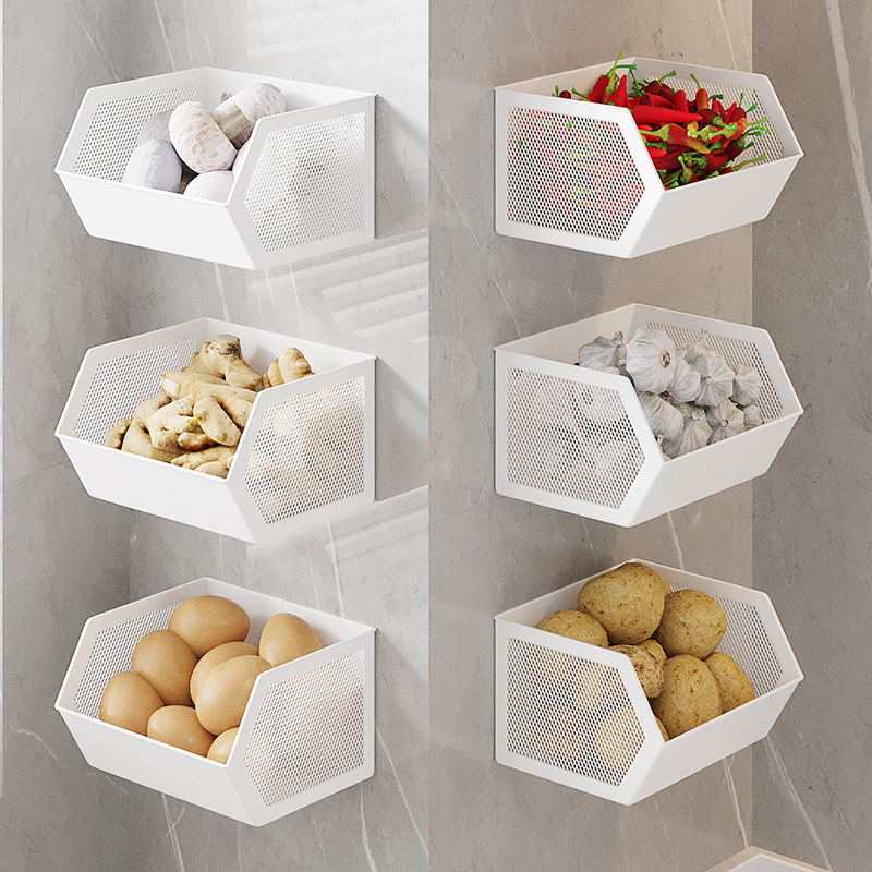台所のネギとショウガのニンニクの収納はかごの物棚の壁掛け式のネットのかごの多機能の壁の調味料の果物と野菜のかごの箱の神器を掛けます。